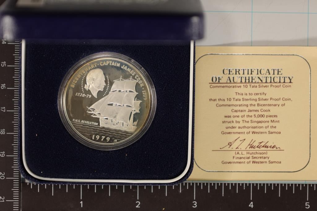 BICENTENNARY OF CAPT. JAMES COOK, IN ORIGINAL MINT PACKAGING BY THE SINGAPORE MINT, CONTAINS: NOT LESS THAN 1 TROY OZ .999 FINE SILVER WITH CERTIFICATE. SOME CLOUDING ON COIN