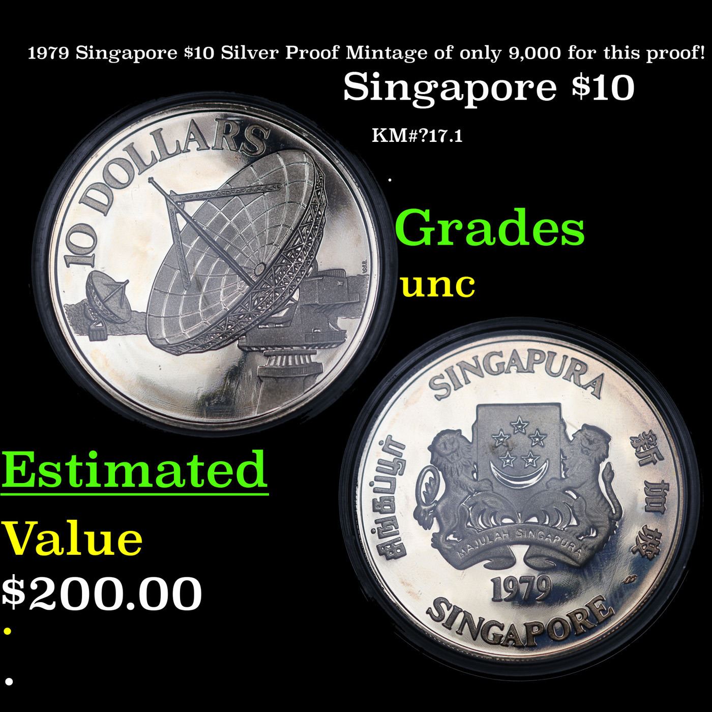 1979 Singapore $10 Silver Proof Mintage of only 9,000 for this proof! Grades GEM++ Proof Deep Cameo