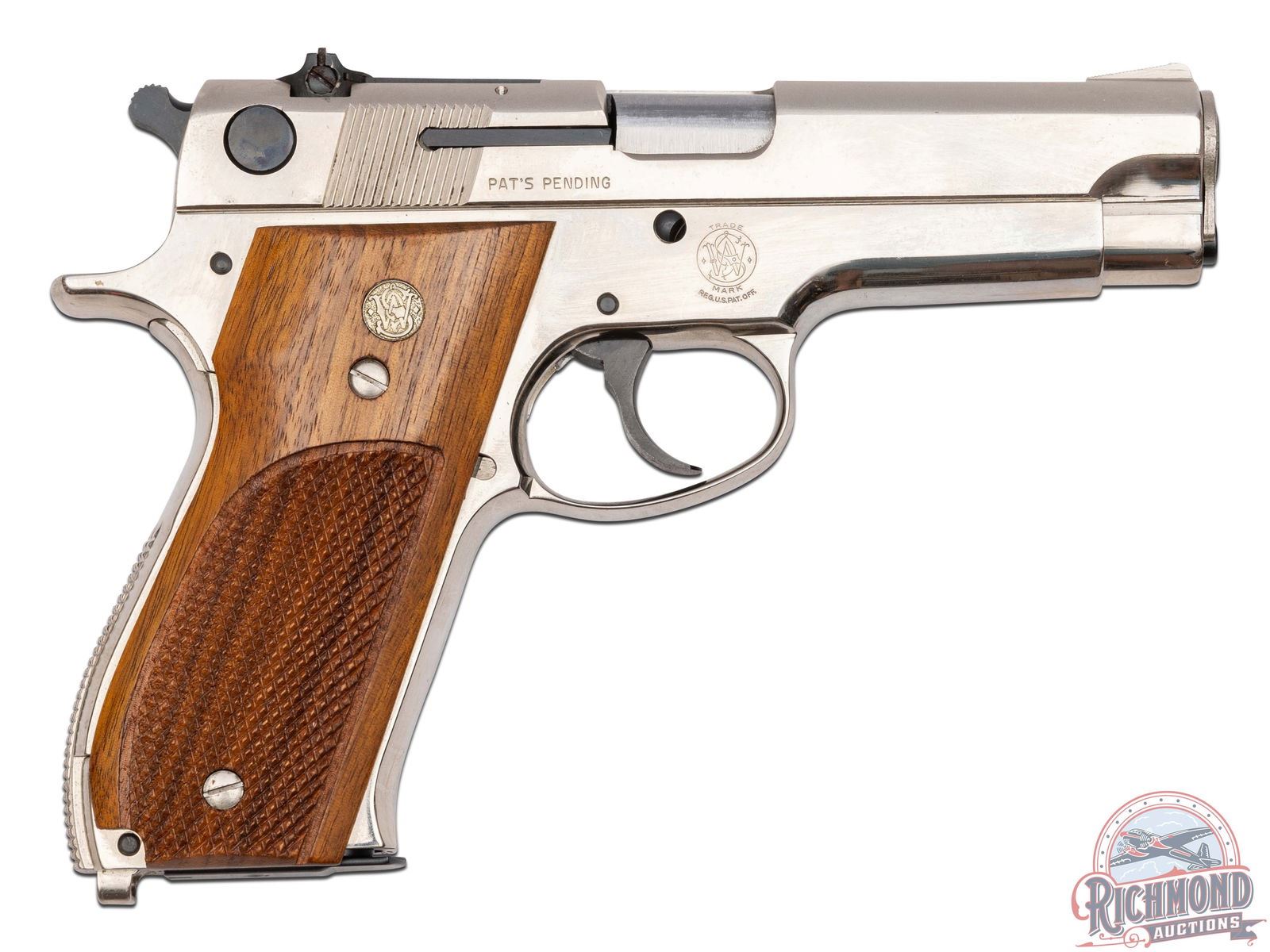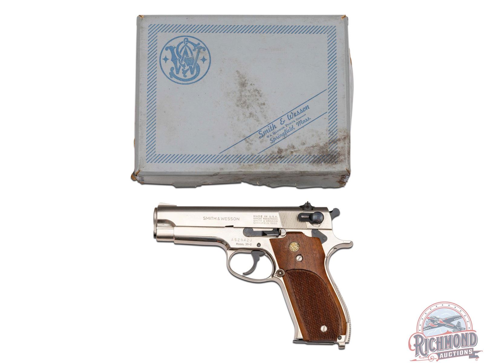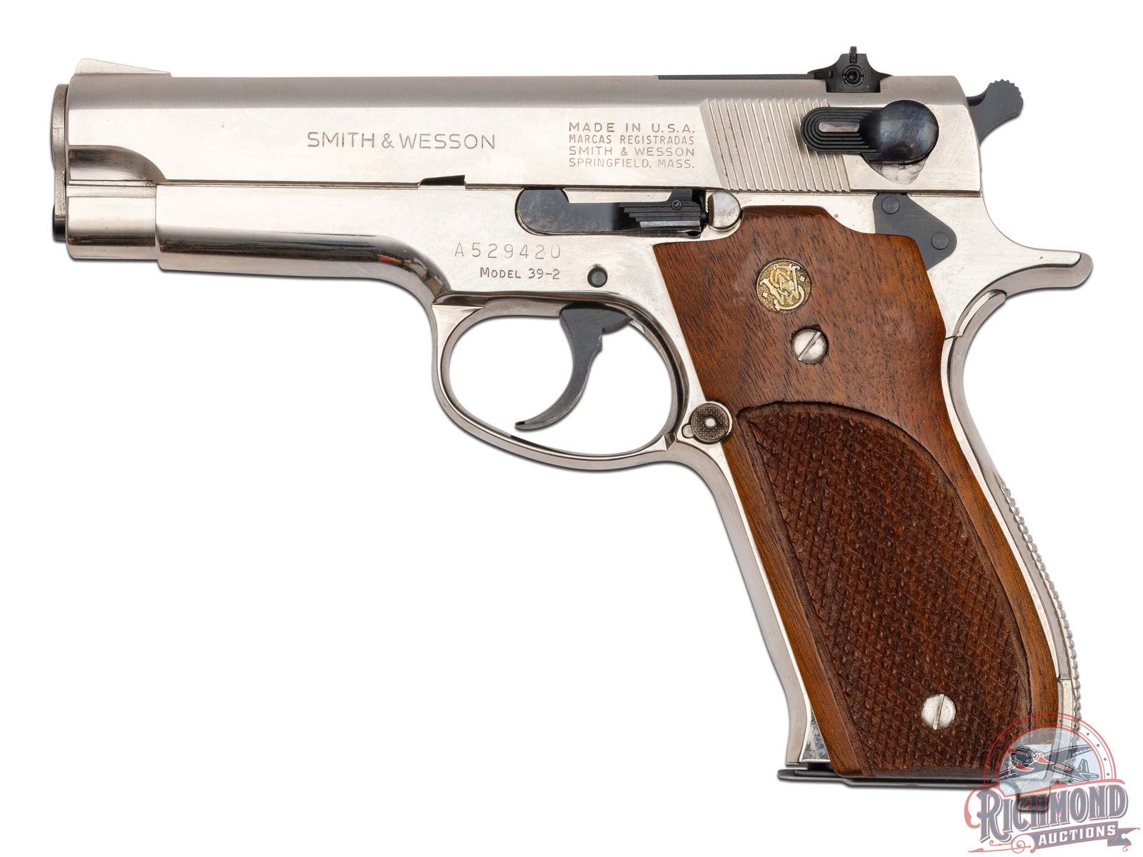 Manufactured circa 1979. This double / single action pistol features a 4" barrel with rear adjustable notch sight and ramp front sight. Polished nickel finish with satin top. Left side of the slide is marked "SMITH & WESSON" / "MADE IN U.S.A. / MARCAS REGISTRADAS / SMITH & WESSON / SPRINGFIELD, MASS." The left side of the frame features the serial number and "MODEL 39-2". The right side of the slide is marked "PAT'S PENDING" with the S&W trade mark logo on the frame below. Textured backstrap and fitted with walnut checkered grip panels with gold tone S&W medallions. Includes two 8-round factory magazines, cleaning rod, manual and factory paperwork. Comes in the original box with factory wax paper. CALIBER: 9mm. S/N: A529420. FFL STATUS: Modern.