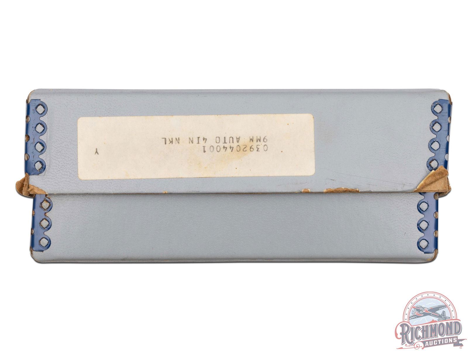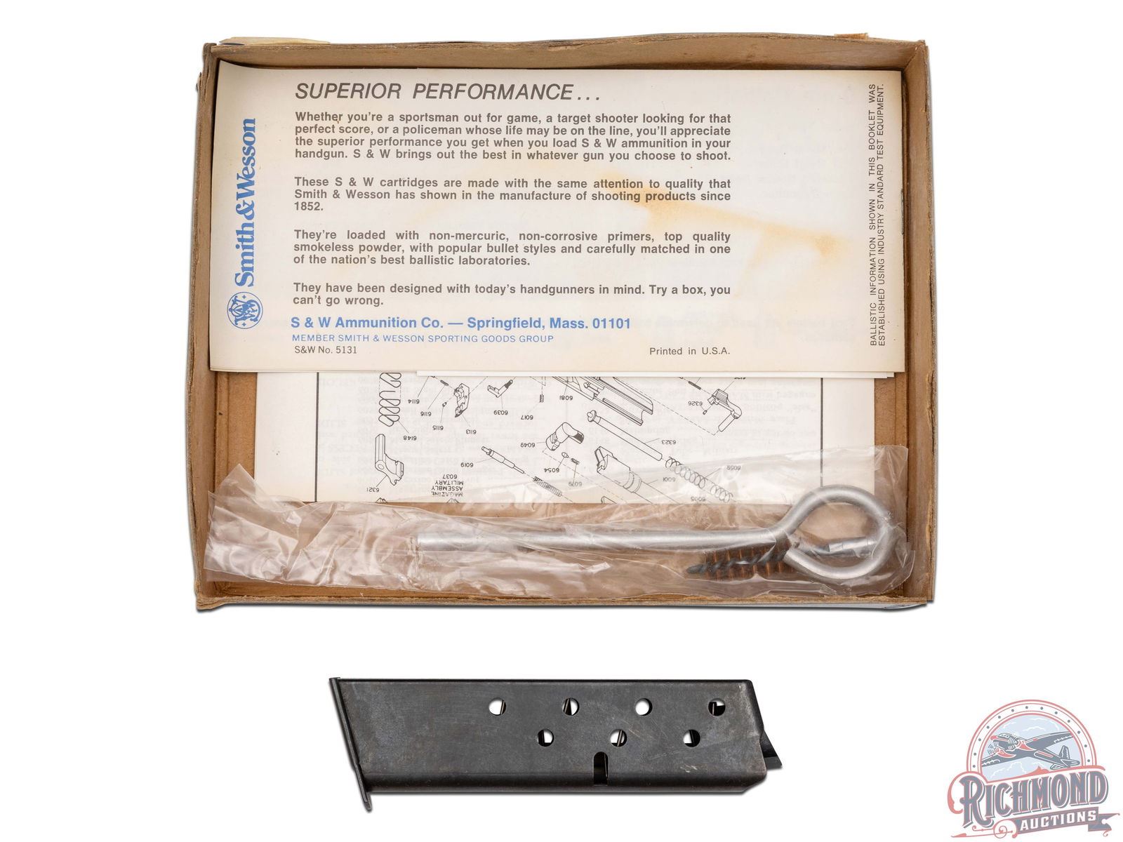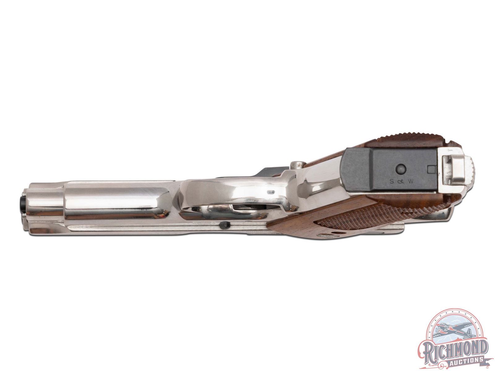Manufactured circa 1979. This double / single action pistol features a 4" barrel with rear adjustable notch sight and ramp front sight. Polished nickel finish with satin top. Left side of the slide is marked "SMITH & WESSON" / "MADE IN U.S.A. / MARCAS REGISTRADAS / SMITH & WESSON / SPRINGFIELD, MASS." The left side of the frame features the serial number and "MODEL 39-2". The right side of the slide is marked "PAT'S PENDING" with the S&W trade mark logo on the frame below. Textured backstrap and fitted with walnut checkered grip panels with gold tone S&W medallions. Includes two 8-round factory magazines, cleaning rod, manual and factory paperwork. Comes in the original box with factory wax paper. CALIBER: 9mm. S/N: A529420. FFL STATUS: Modern.