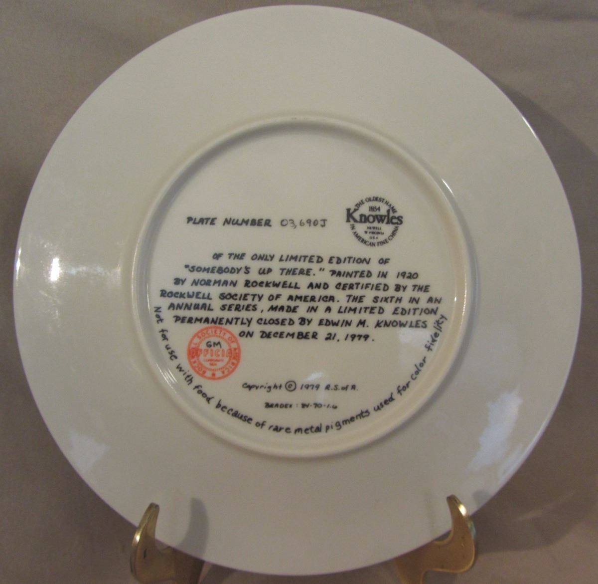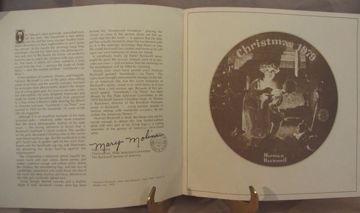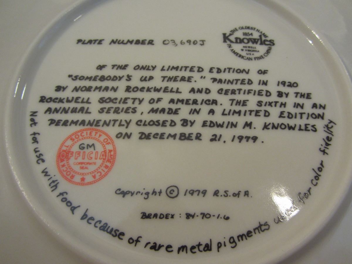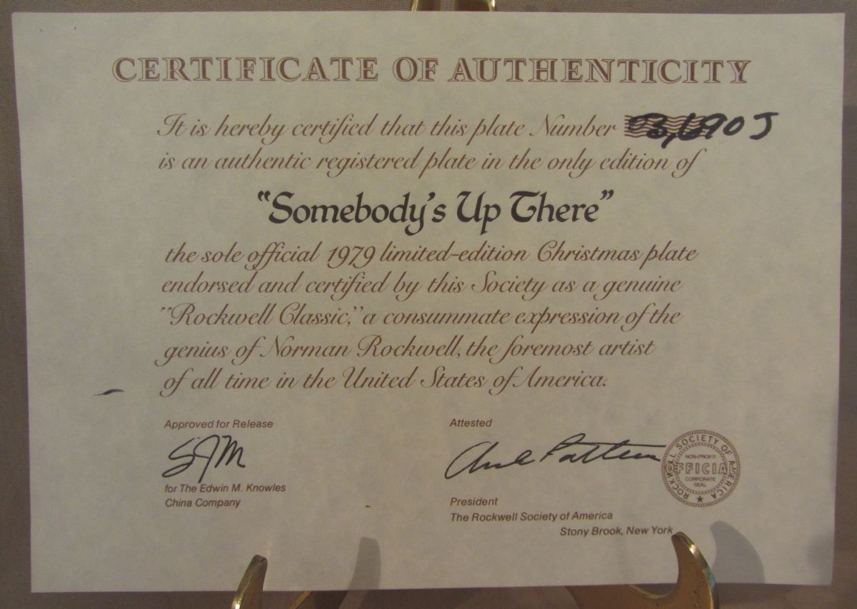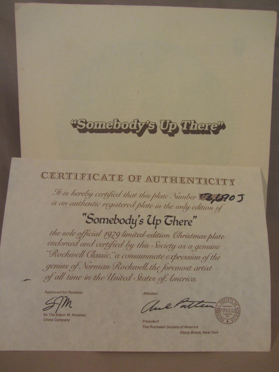 8 1/2" plate, dated 1979 'Somebody's Up There' this plate is a limited-edition Christmas plate is endorsed and certified as a genuine 'Rockwell Classic'. The plate number is 03,690 J, Bradex Number: 80-70-1.6 and made available by Edwin M. Knowles Co. It comes in the original box, with paperwork and COA. (Please see images for details)