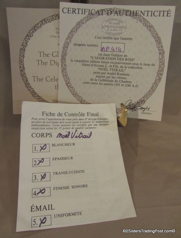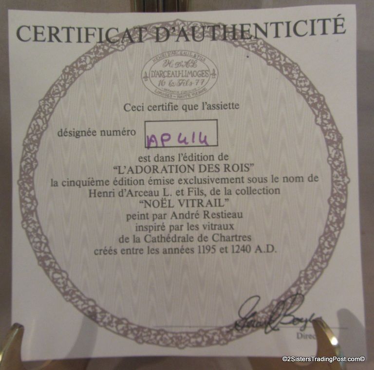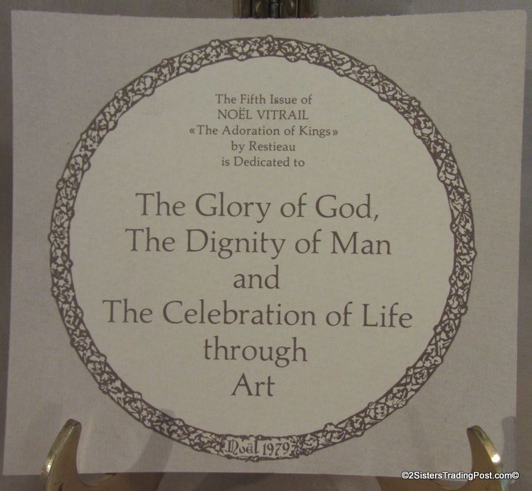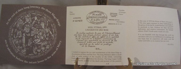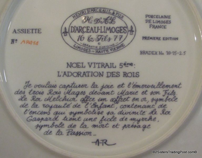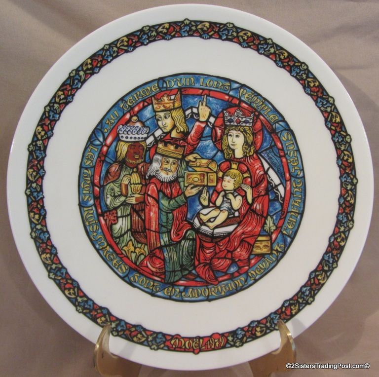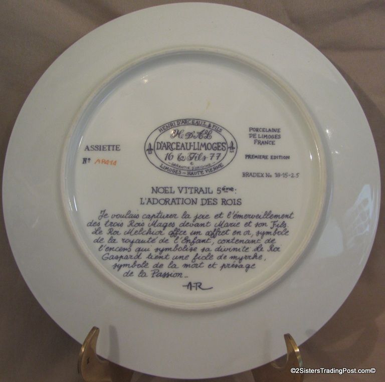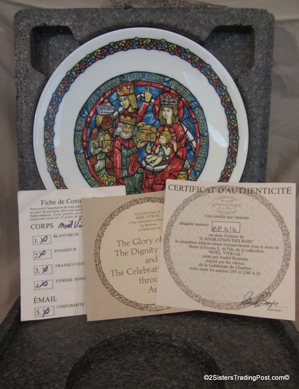 8 1/2" plate, dated 1979 'The Adoration of Kings' the fifth issue of Noel Vitrail *The Purification* by Restieau and is dedicated to "The Glory of God, The Dignity of Man and The Celebration of Life through Art". This is a Limoges Porcelain plate and is numbered AP 414 Brades Number 18-15-2.5. Comes in the original Styrofoam mailer, with paperwork and COA. (Please see images for details)