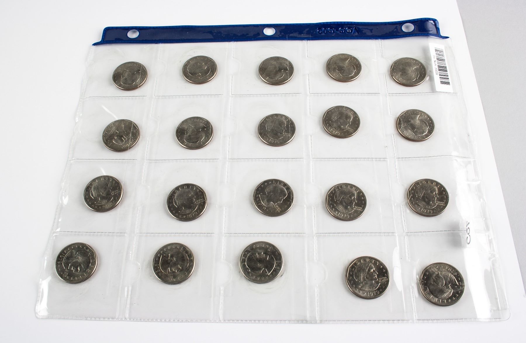 20 pieces of uncirculated 1979 United States 1 Dollar copper-nickel coin; obverse engraved ortrait of Susan B Anthony, a pioneer for women's rights, lettering LIBERTY 1979, IN GOD WE TRUST; reverse engraved the Apollo 11 Mission Insignia: an eagle holding an olive branch flying above the Moon, with the Earth in the background, lettering UNITED STATES OF AMERICA, E·PLURIBUS·UNUM·, FG, ONE DOLLAR; reeded edge; 2.1 cm, 192 grams (total)
