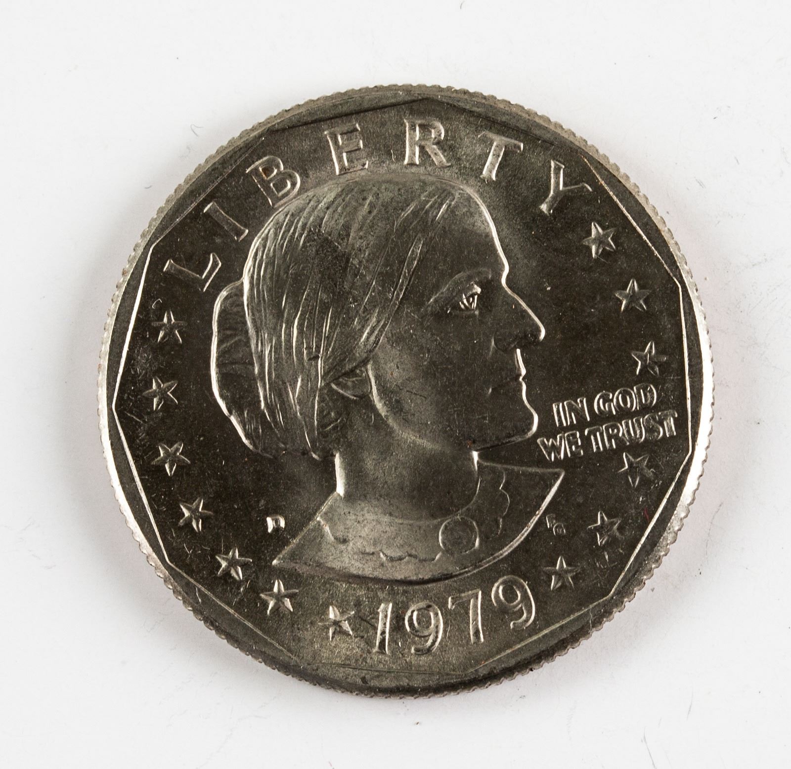 20 pieces of uncirculated 1979 United States 1 Dollar copper-nickel coin; obverse engraved ortrait of Susan B Anthony, a pioneer for women's rights, lettering LIBERTY 1979, IN GOD WE TRUST; reverse engraved the Apollo 11 Mission Insignia: an eagle holding an olive branch flying above the Moon, with the Earth in the background, lettering UNITED STATES OF AMERICA, E·PLURIBUS·UNUM·, FG, ONE DOLLAR; reeded edge; 2.1 cm, 192 grams (total)