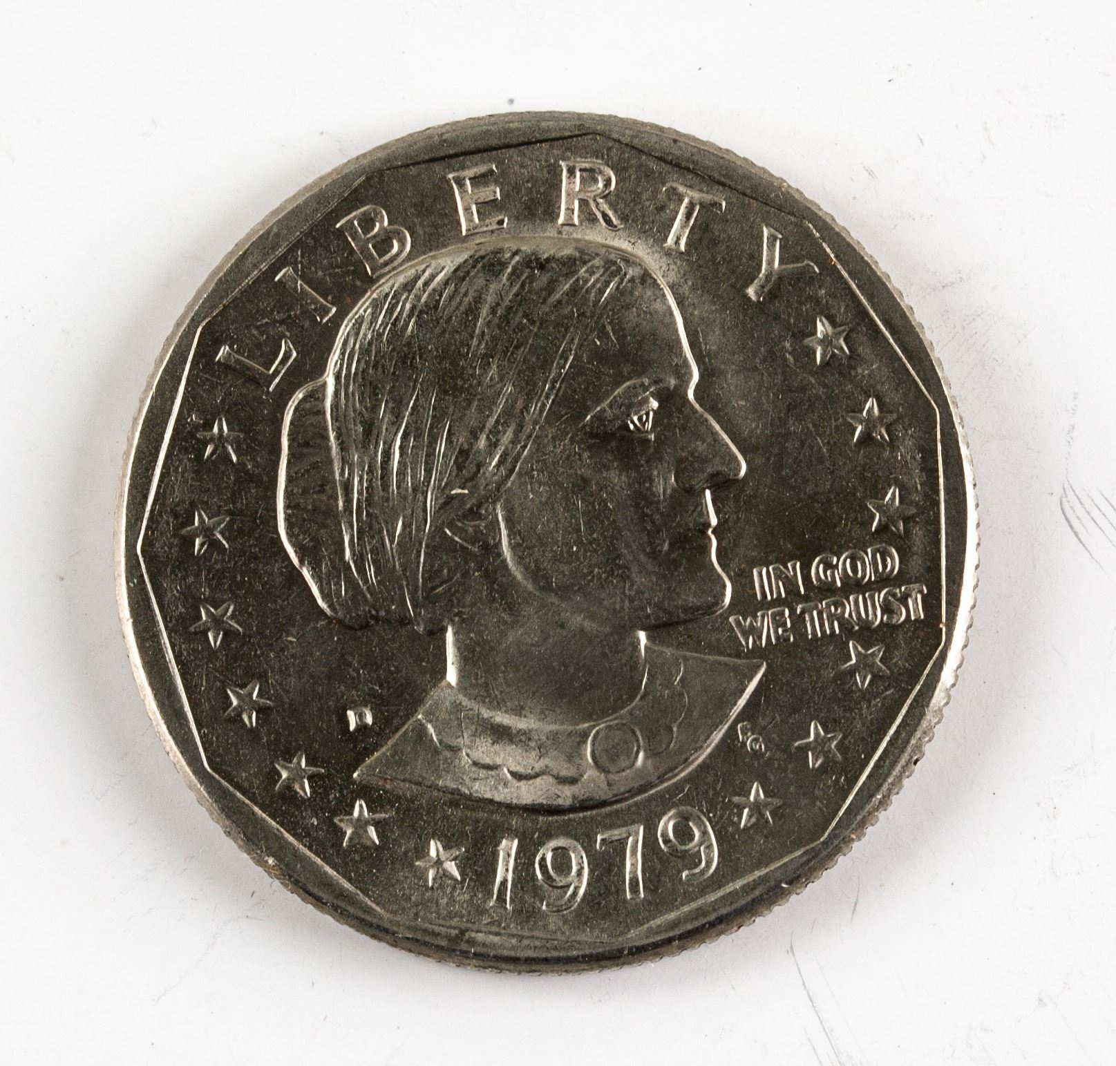 20 pieces of uncirculated 1979 United States 1 Dollar copper-nickel coin; obverse engraved ortrait of Susan B Anthony, a pioneer for women's rights, lettering LIBERTY 1979, IN GOD WE TRUST; reverse engraved the Apollo 11 Mission Insignia: an eagle holding an olive branch flying above the Moon, with the Earth in the background, lettering UNITED STATES OF AMERICA, E·PLURIBUS·UNUM·, FG, ONE DOLLAR; reeded edge; 2.1 cm, 192 grams (total)