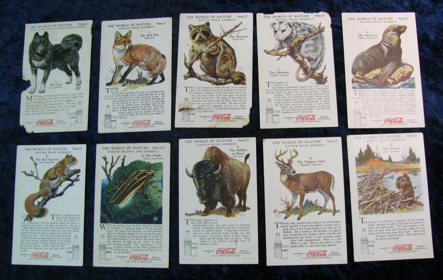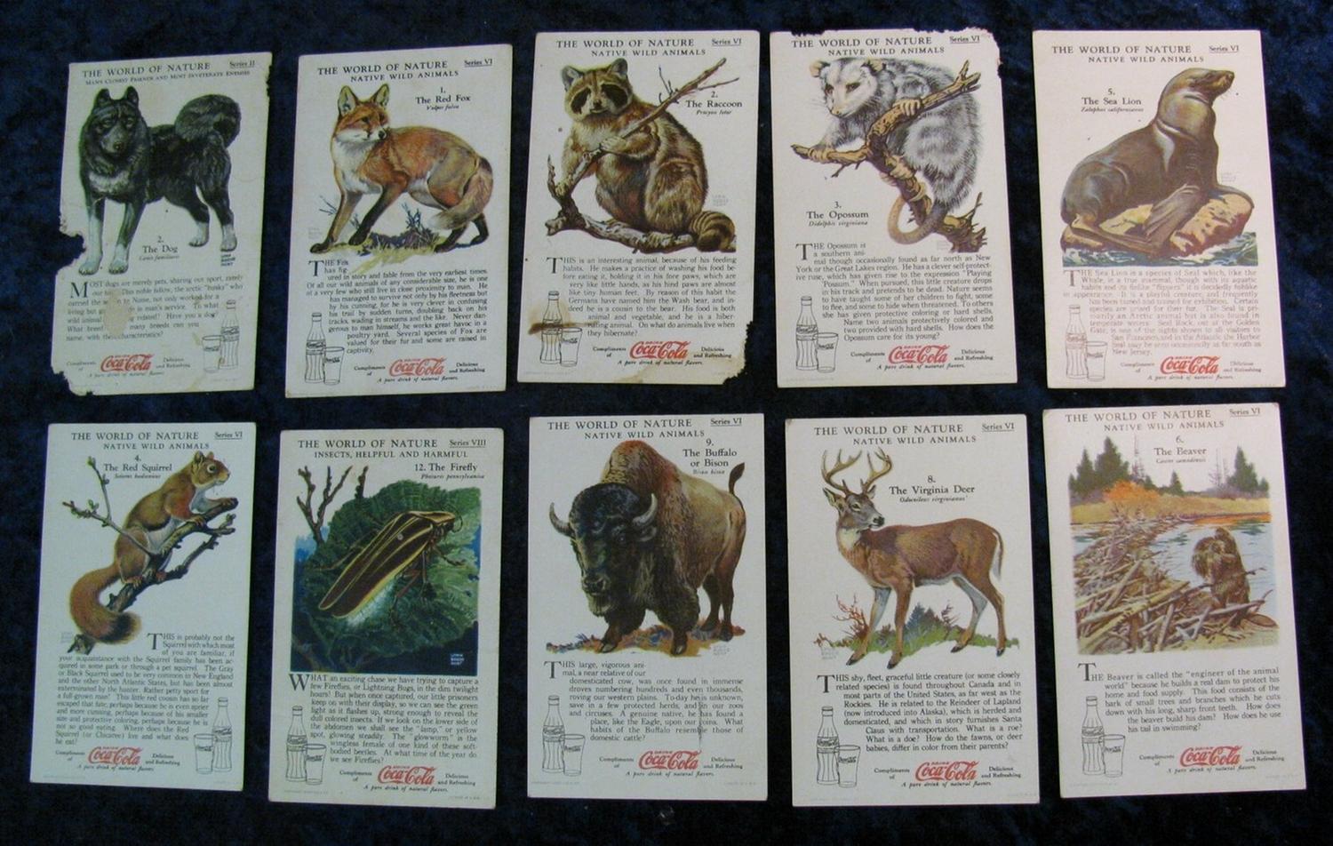 198. (10) Different World of Nature Coca-Cola Advertising Cards. Includes Sea Lion, Beaver, Virginia Deer, Bison, Firefly, Red Squirrel, Opossum, Raccoon, Red Fox, & The Dog.