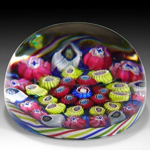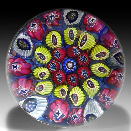 Antique Val St. Lambert concentric millefiori paperweight, with a blue and white center cane, surrounded by concentric rings of assorted complex cross canes, on blue ground. A blue, red, green, and yellow-striped white torsade encircles the perimeter of the piece. Diameter 3 1/2". NO RESERVE