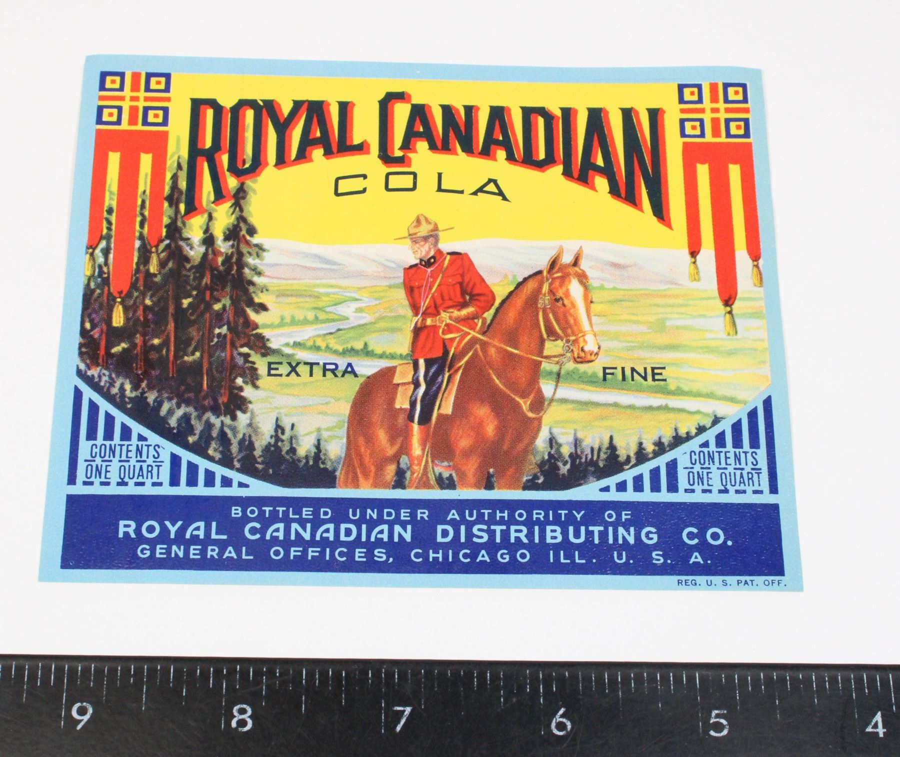 CANADIAN MOUNTIE ROYAL CANADIAN MOUNTED POLICE DESIGN, VINTAGE UNUSED BOTTLE LABEL FROM ROYAL CANADIAN DISTRIBUTING CO CHICAL ILLINOIS USA