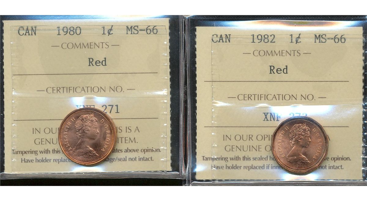 1980 1¢ & 1982 ICCS MS66RD. Lot of 2 Gem full red coins.