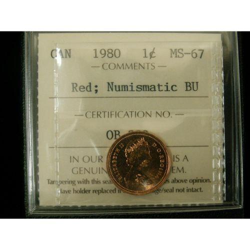 1980 1¢ ICCS MS-67 Red, Num.BU, Believed to be the finest graded example
