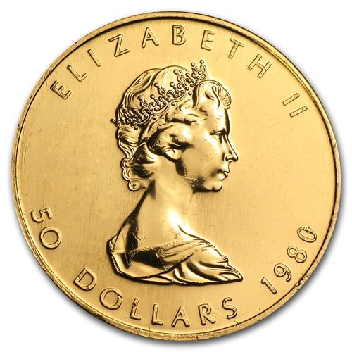 1980 1 oz Gold Canadian Maple Leaf **|**|** Year: 1980 ; Mint Mark: Brilliant Uncirculated ; Denomination: $50 ; MSRP: $2400