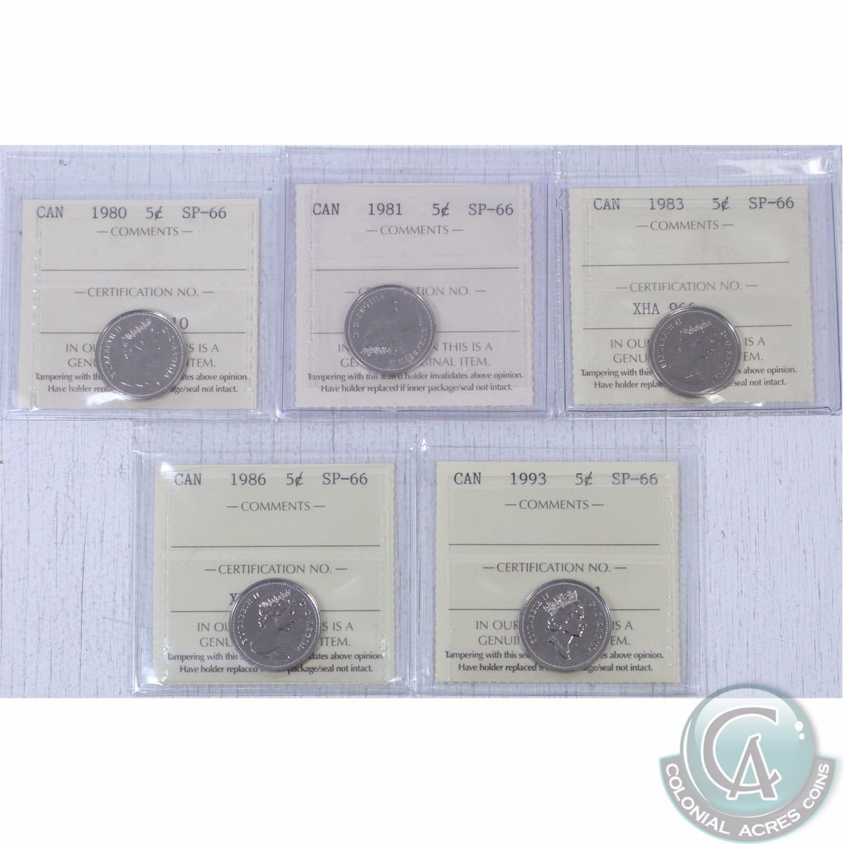 1980, 1981, 1983, 1986 and 1993 Canada 5-cent ICCS Certified SP-66. 5pcs