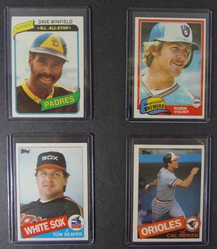 This Baseball Card Lot is loaded with multiple Stars such as 16 - 1980 Topps #230 Dave Winfields, 18 - 1985 Topps Ripken Jr. and 4 - 1985 Topps #670 Seaver, 5-1981 Topps Yount and many more Stars, simi-stars and commons. Est. Value $75.00 - $100.00.