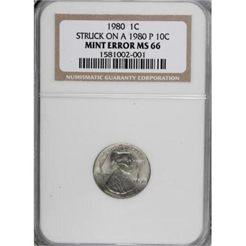 <B>1980 1C Lincoln Cent--Struck on a 1980-P Dime--MS66 NGC.</B></I> The dime date and mintmark are legible at 10 o'clock relative to the cent strike. The cent date is bold. Roosevelt's inverted bust outlines the portrait of Lincoln. The flame of the torch reaches the E in ONE. Lustrous and lightly toned with an unabraded appearance.<BR><BR><B>Coin Engraver:</B> Victor D. Brenner<BR><BR><b>Shipping:</b> Coins & Currency (<a target="_blank" href="http://www.heritageauctions.com/common/shipping.php">view shipping information</a>)