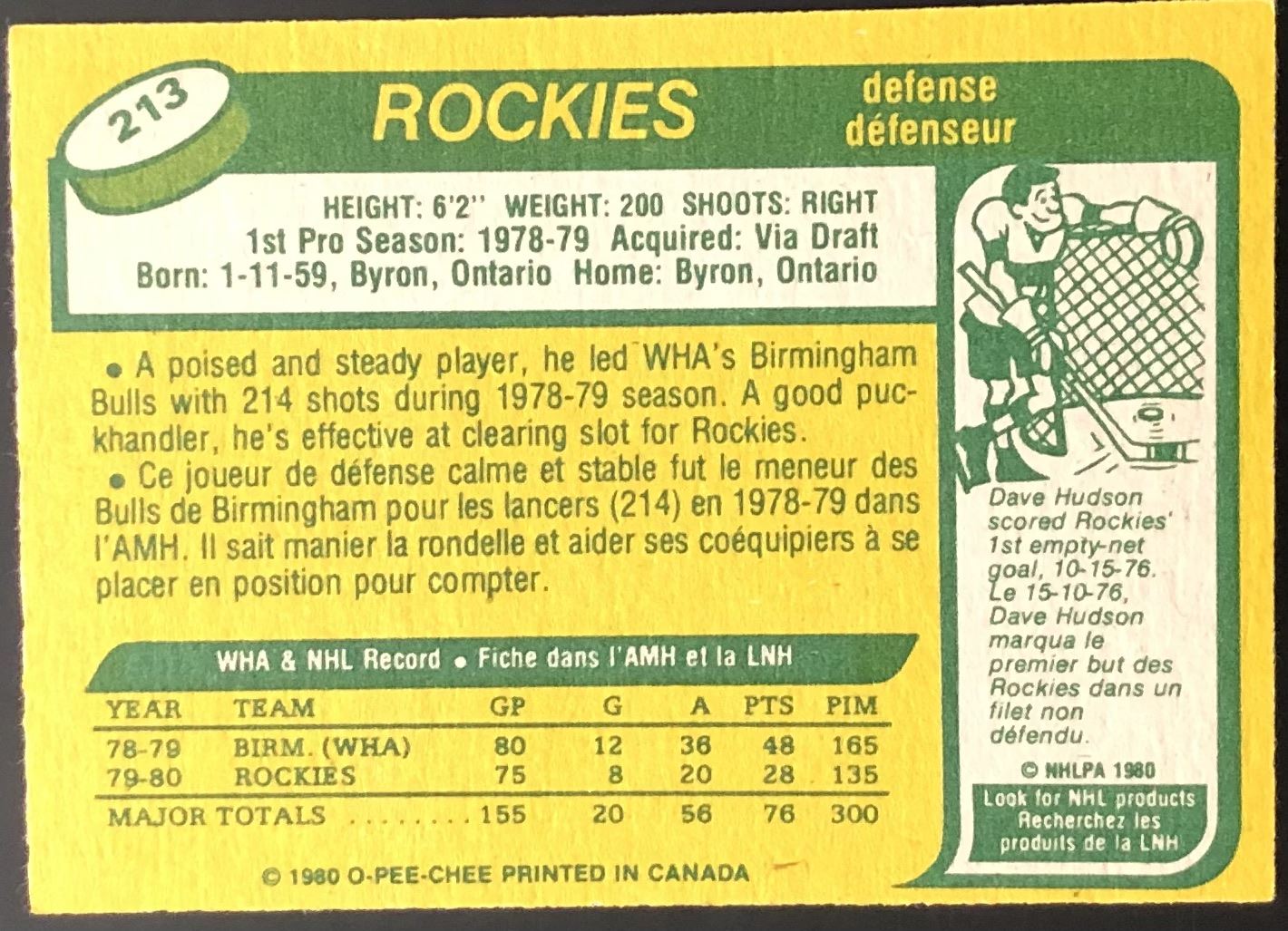 Card #213 NHL, hockey, OPC, vintage, rookie