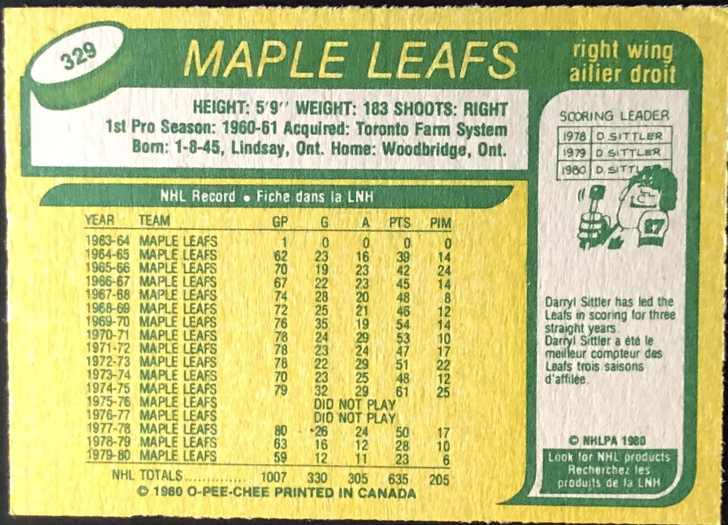 Card #329 NHL, hockey, vintage, OPC, hall of fame