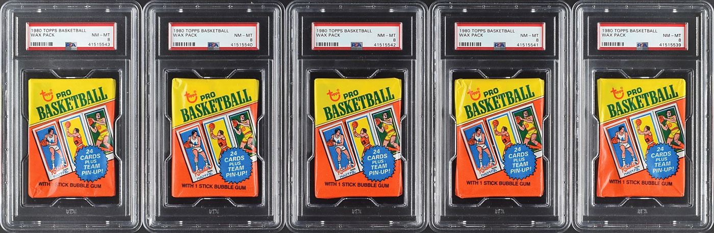 Offered are FIVE packs from the very popular 1980-81 Topps Basketball issue, with each possibly containing the Larry Bird/Magic Johnson rookie card. Each pack has recently been graded by PSA at the NM-MT 8 level, and all have solid seals and appear "fresh from the box" condition.