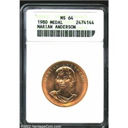 1980 American Arts Commemorative Series Half Ounce Gold Medal MS64 ANACS. Marian Anderson. There is some light iridescence on both sides, but the outward appearance is one of fulsome golden-rose color. A few trivial abrasions in the centers are all that stand between this medal and an even higher grade. Important notice: We expect to be auctioning lots at the rate of 200-250 per hour. Sometimes eBay Premier live bid software cannot keep up with that pace, so we strongly recommend that you place a realistic proxy bid now as insurance to avoid disappointment. Also please note that all Heritage/CAA lots purchased through eBay Premier carry a 20% Buyer's Premium. Please make sure you read the Terms and Conditions.