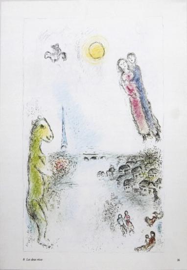 Reference #: ULXX3322 Artist Name: Chagall, Marc Title: Les Deaux Rives Medium: Lithograph Edition Size: unknown Year: 1980 Paper Size: 15 x 11 inches Image Size: 15 x 11 inches Condition: A-: Near Mint, very light signs of handling Notes: Original lithograph from Derriere le miroir, no. 246, 1981, page 16, number 8 "Les Deaux Rives" 1980. Published by Maeght, Paris. Measures 15 x 11 inches.
