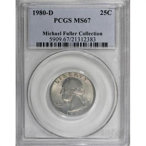 <B>1980-D 25C MS67 PCGS.</B></I> This satiny example exhibits khaki-gray toning with just a touch of milkiness in the fields. Most of the design elements are boldly struck, but the mintmark is mushy. Population: 16 in 67, 0 finer (10/07). <BR><I>From The Michael Fuller Collection.</B></I><BR><BR><B>Coin Engraver:</B> John Flanagan<BR><BR><b>Shipping:</b> Coins & Currency (<a target="_blank" href="http://www.heritageauctions.com/common/shipping.php">view shipping information</a>)