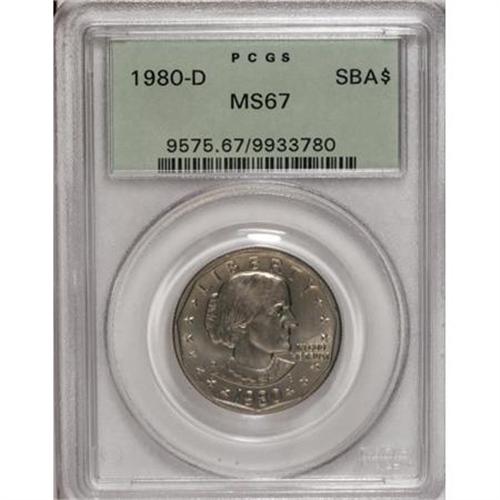 <B>1980-D SBA$ MS67 PCGS.</B></I> PCGS Population (118/0). NGC Census: (106/0). Mintage: 41,628,708. Numismedia Wsl. Price for NGC/PCGS coin in MS67: $130. (#9575)<BR><BR><b>Shipping:</b> Coins & Currency (<a target="_blank" href="http://www.heritageauctions.com/common/shipping.php">view shipping information</a>)