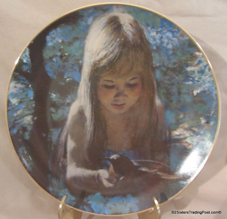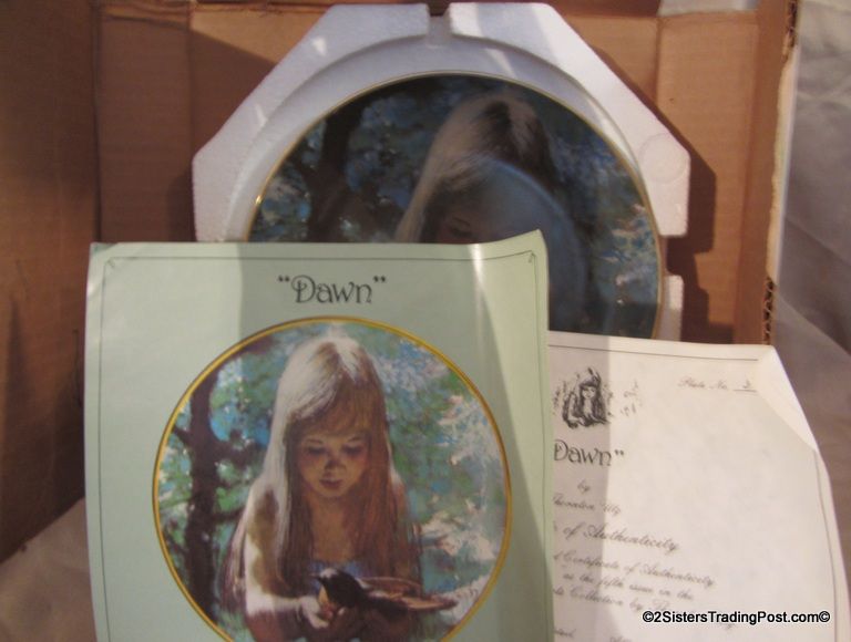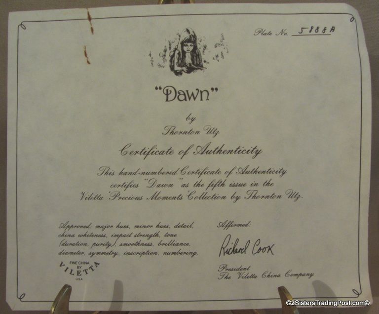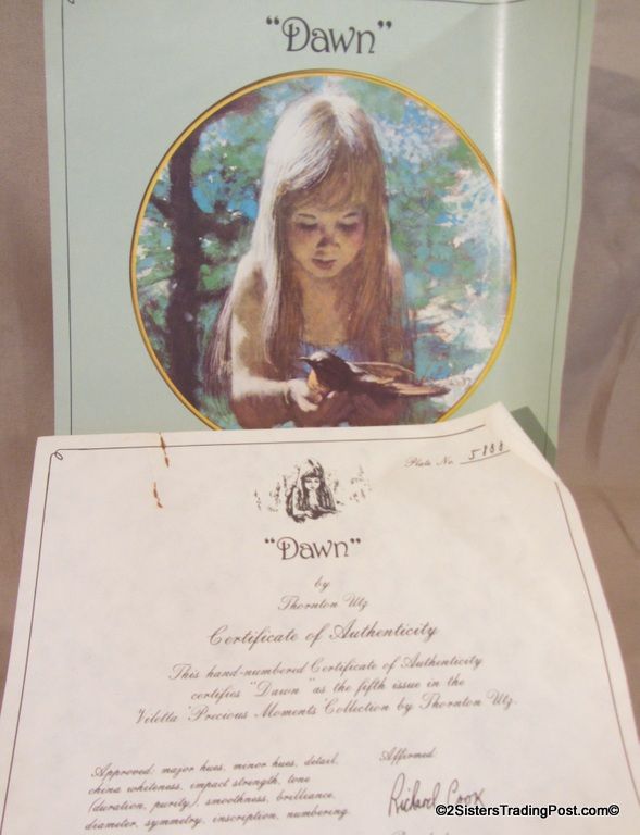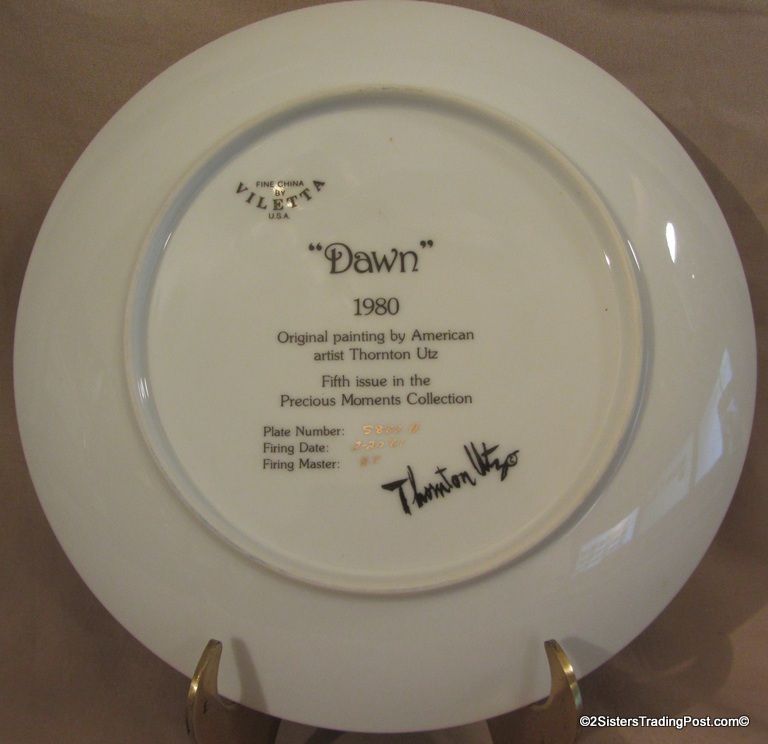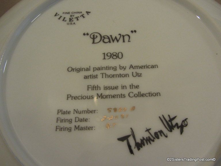 8 1/2" plate, dated 1980 'Dawn' this plate is the fifth issue in the Viletta 'Precious Moments Collection' by Thornton Utz. The Plate has 24K gold rim, plate number 5888 A, Firing date 2-20-81, Firing master R. T, comes in the original box, with paperwork and COA. (Please see images for details)