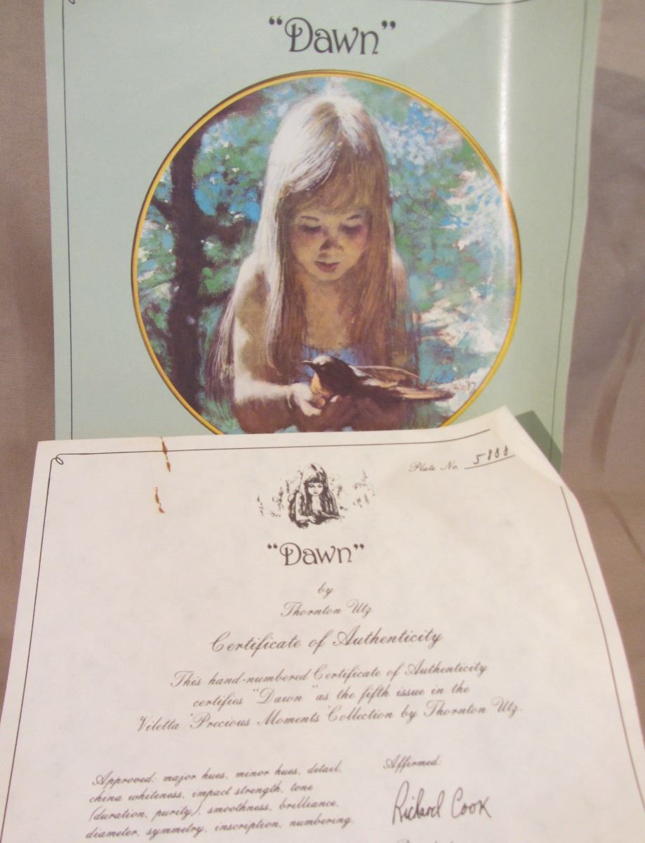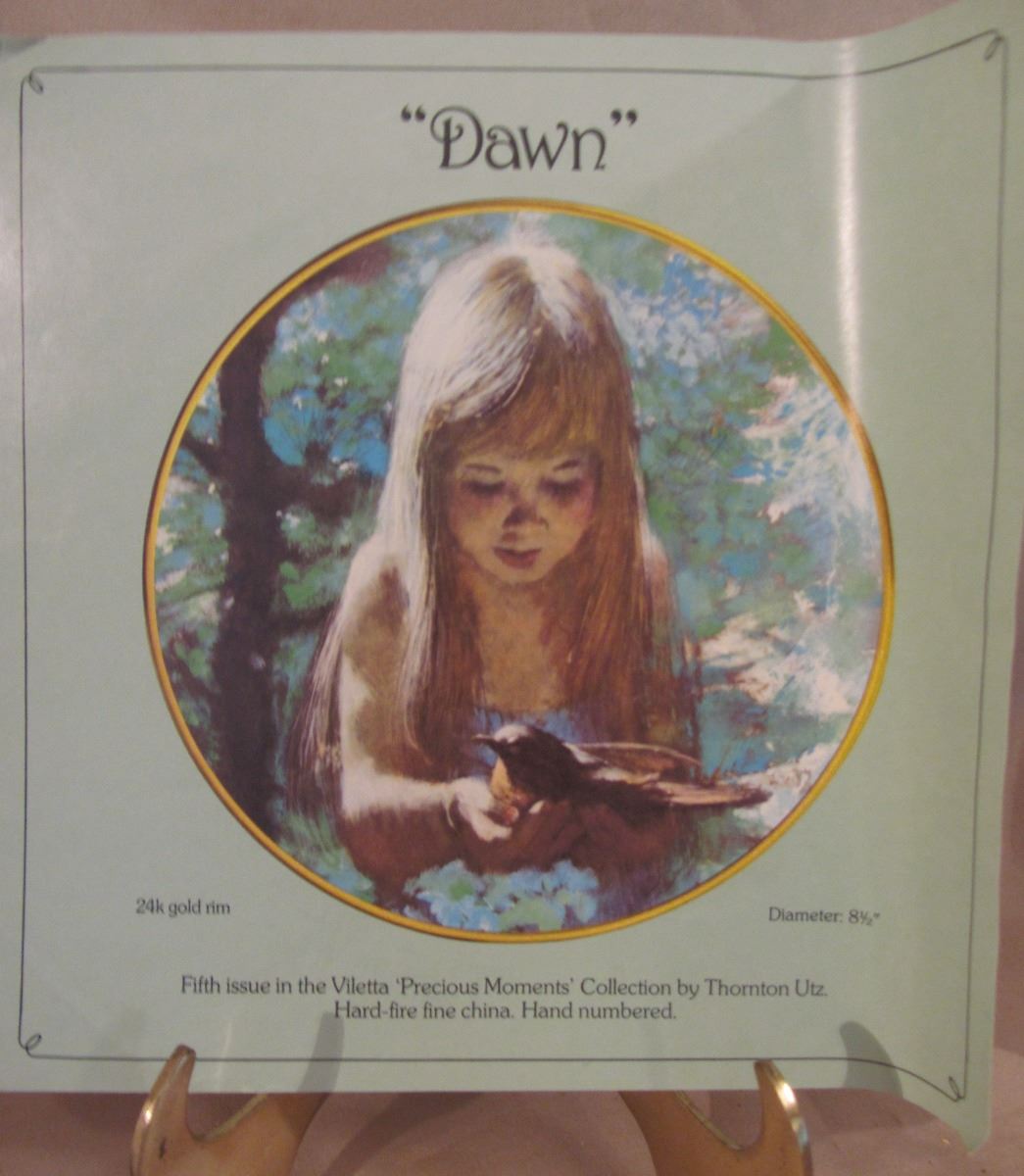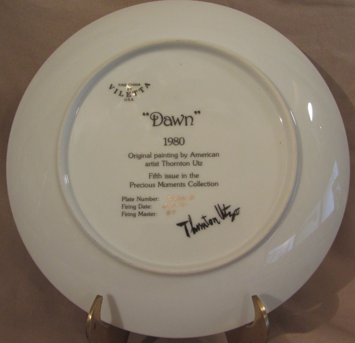8 1/2" plate, dated 1980 'Dawn' this plate is the fifth issue in the Viletta 'Precious Moments Collection' by Thornton Utz. The Plate has 24K gold rim, plate number 5888 A, Firing date 2-20-81, Firing master R. T, comes in the original box, with paperwork and COA. (Please see images for details)