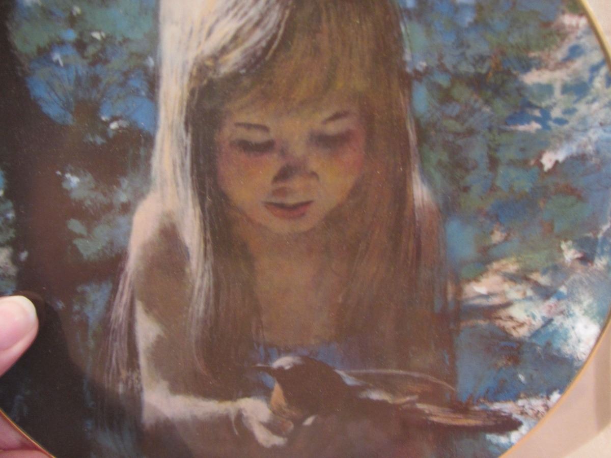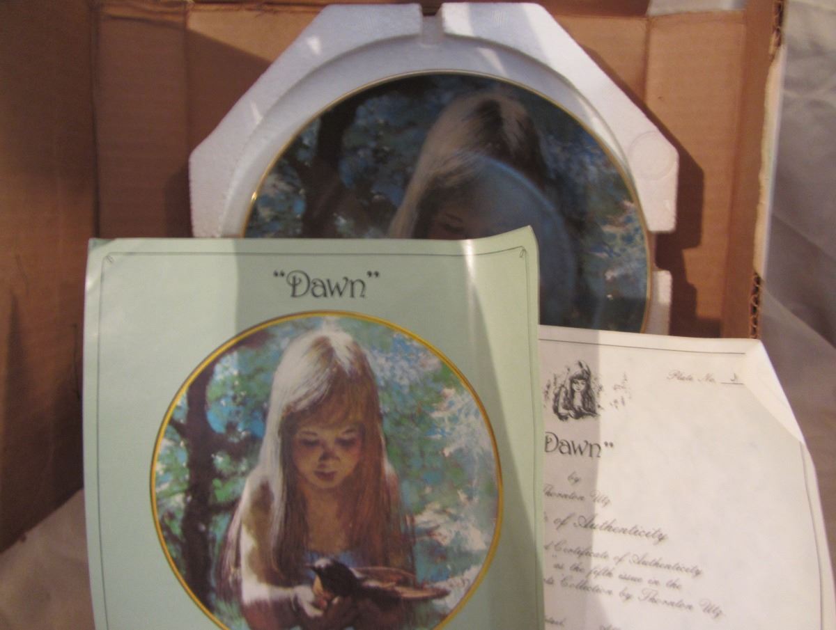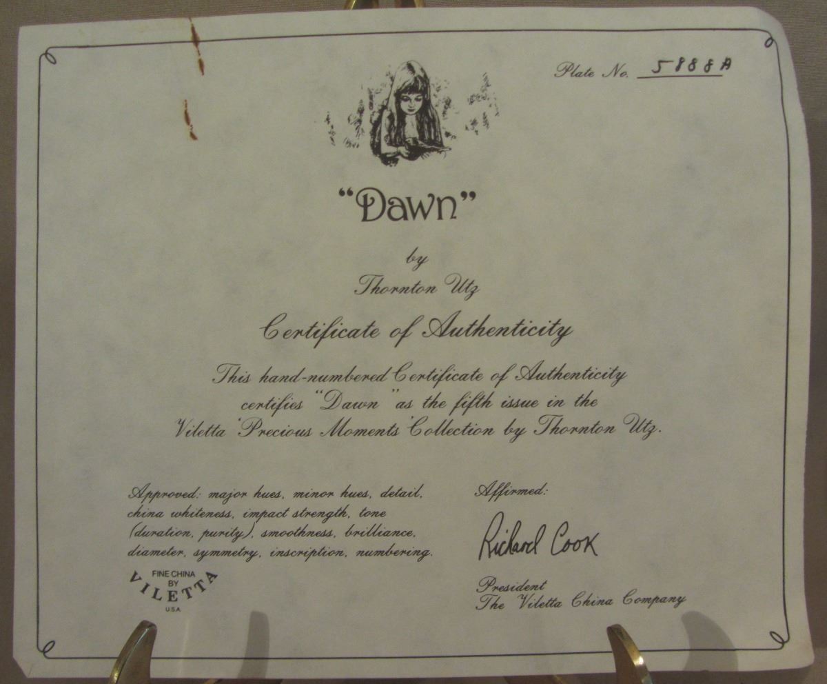 8 1/2" plate, dated 1980 'Dawn' this plate is the fifth issue in the Viletta 'Precious Moments Collection' by Thornton Utz. The Plate has 24K gold rim, plate number 5888 A, Firing date 2-20-81, Firing master R. T, comes in the original box, with paperwork and COA. (Please see images for details)