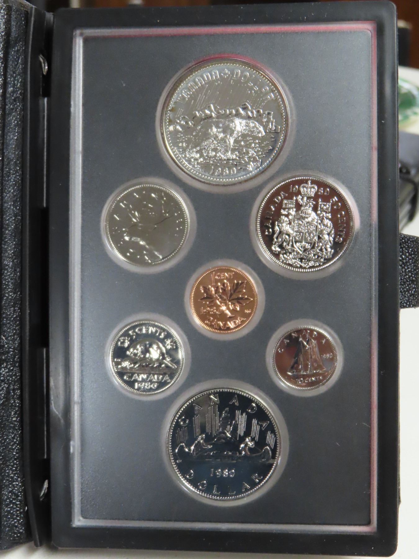1980 Double Dollar Specimen Set. The Silver Dollar commemorates the 100th Anniversary of Great Britain ceding the Arctic Islands to Canada. Popular Polar Bear. Housed in its original Royal Canadian Mint case of issue. Includes Certificate of Authenticity.