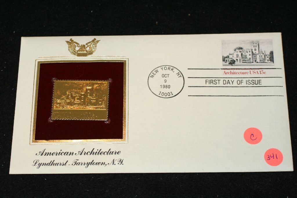 1980 First Day Issue 22K Gold Replica Stamp W/Postal Stamp; American Architecture Lyndhurst-Tarrytown NY