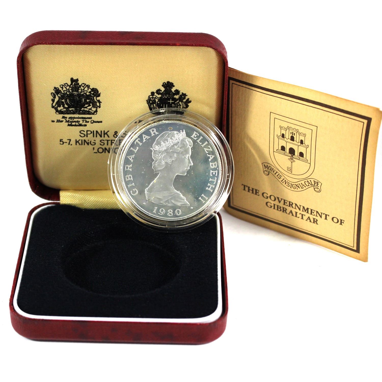 1980 Gibraltar Sterling Silver proof one crown commemorating the 175th anniversary of the Lord Horatio Nelson ( .8410 oz. pure silver). Coin is toned and packaging shows signs of aging.