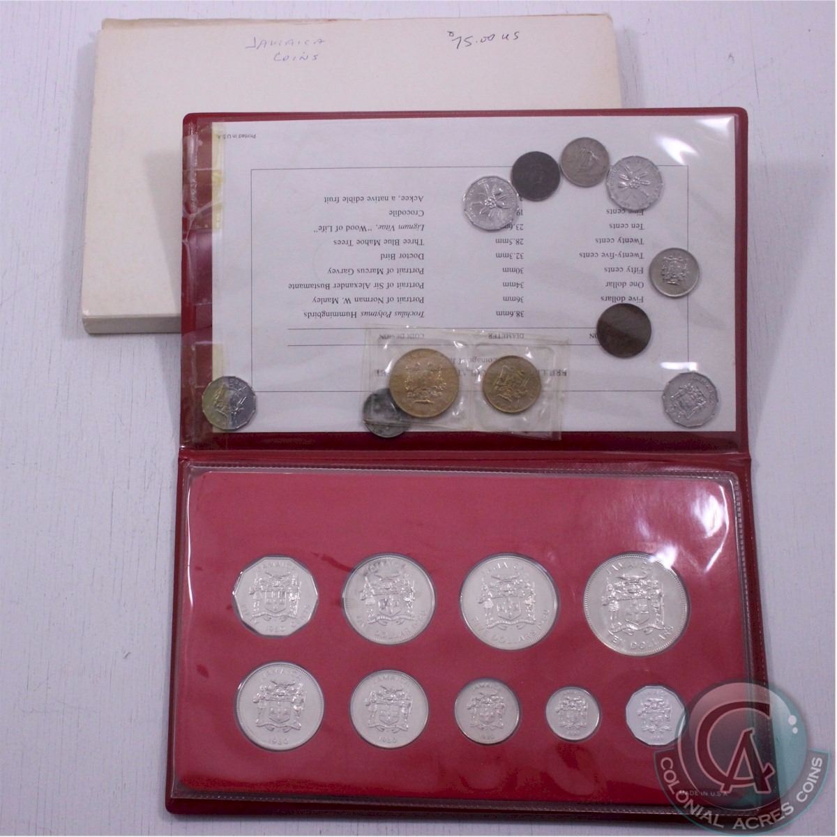 1980 Jamaican Brilliant Uncirculated 9-Coin Specimen Set with x11 Bonus Various Jamaican Coins. You will receive the following denomination within the specimen set: 1-cent, 5-cent, 10-cent, 20-cent, 25-cent, 50-cent, $1, $5 and $10. Outer case contains tape residue but coins are protected within a plastic holder. (20pcs)