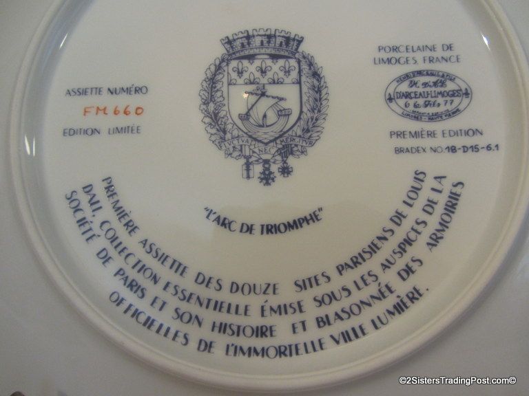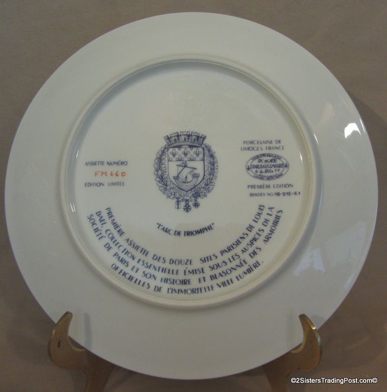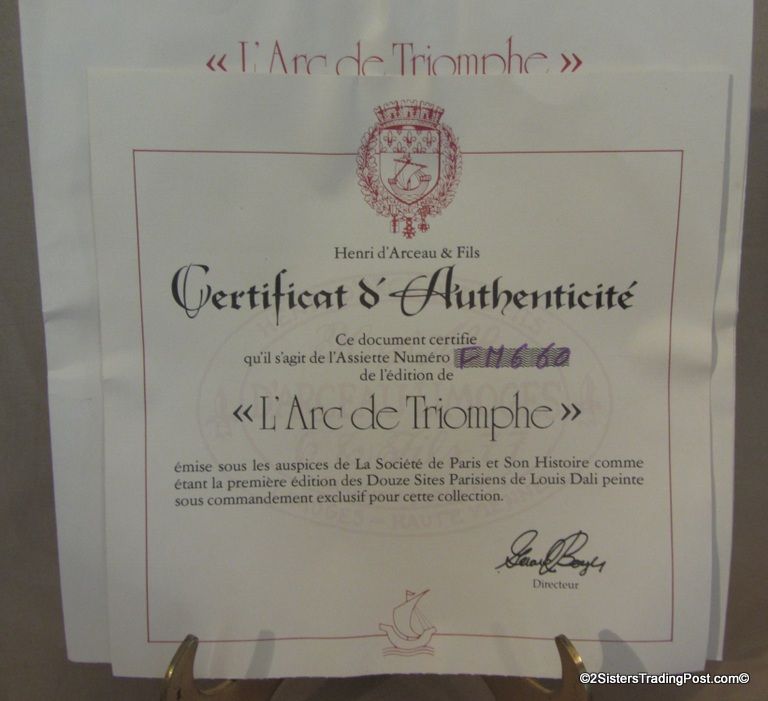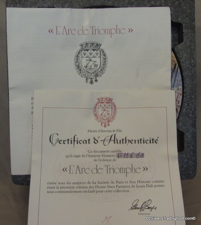 8 1/2" plate, dated 1980 'L'arc de Triomphe' by Louis Dali. Limoges plate number FM660 Bradex number 18-D15-6.1. Comes with paperwork and the original Styrofoam protector. (Please see images for details).