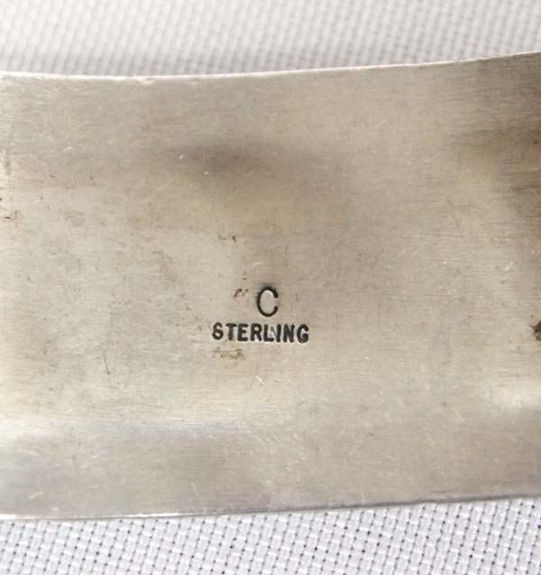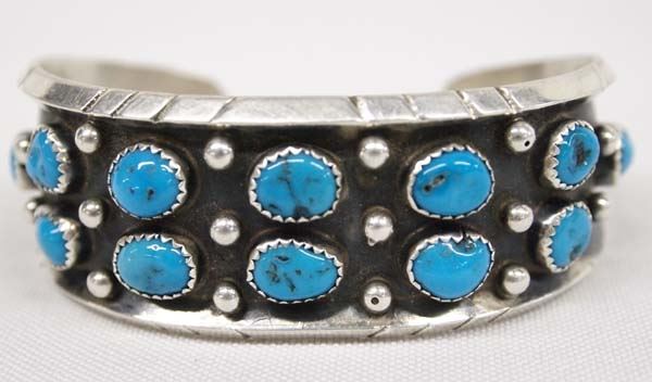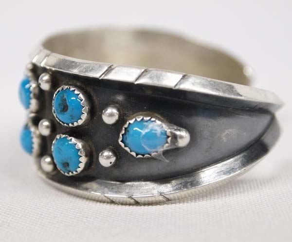 1980 Native American Navajo Sterling Silver Turquoise Bracelet by Max Calladito, all sterling silver set with nugget turquoise cabochons, hallmarked C and stamped sterling, inside measures 6.75'' which includes opening x 1'', 36.03g in total wt.