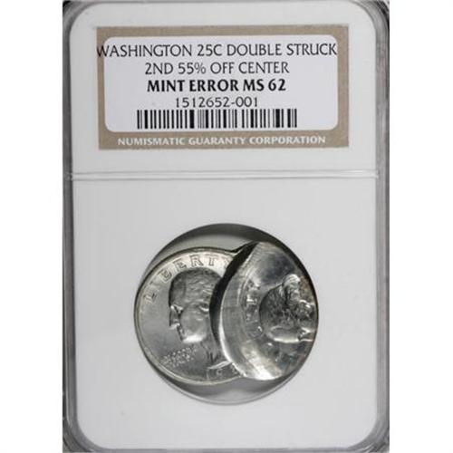 <B>198? Washington Quarter--Double Struck, Second Strike 55% Off Center-- MS62 NGC.</B></I><BR><BR><B>Coin Engraver:</B> John Flanagan<BR><BR><b>Shipping:</b> Coins & Currency (<a target="_blank" href="http://www.heritageauctions.com/common/shipping.php">view shipping information</a>)