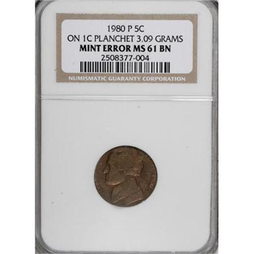 <B>1980-P 5C Jefferson Nickel--On 1C Planchet--MS61 Brown NGC.</B></I> 3.09 Grams<BR><BR><B>Coin Engraver:</B> Felix Schlag<BR><BR><b>Shipping:</b> Coins & Currency (<a target="_blank" href="http://www.heritageauctions.com/common/shipping.php">view shipping information</a>)
