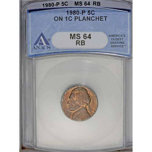 1980-P 5C --Struck on a Cent Planchet--MS64 Red and Bro