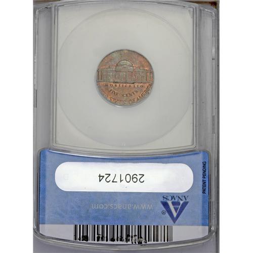 <B>1980-P<5C> Jefferson Nickel--Struck on a Cent Planchet--MS64 Red and Brown ANACS.</B></I> Original copper-orange mixes with violet and tan. Partial legends appear on the obverse, while E PLURIBUS UNUM is nearly missing from the reverse. Two marks, possibly from the original planchet, are noted on Jefferson's cheek.