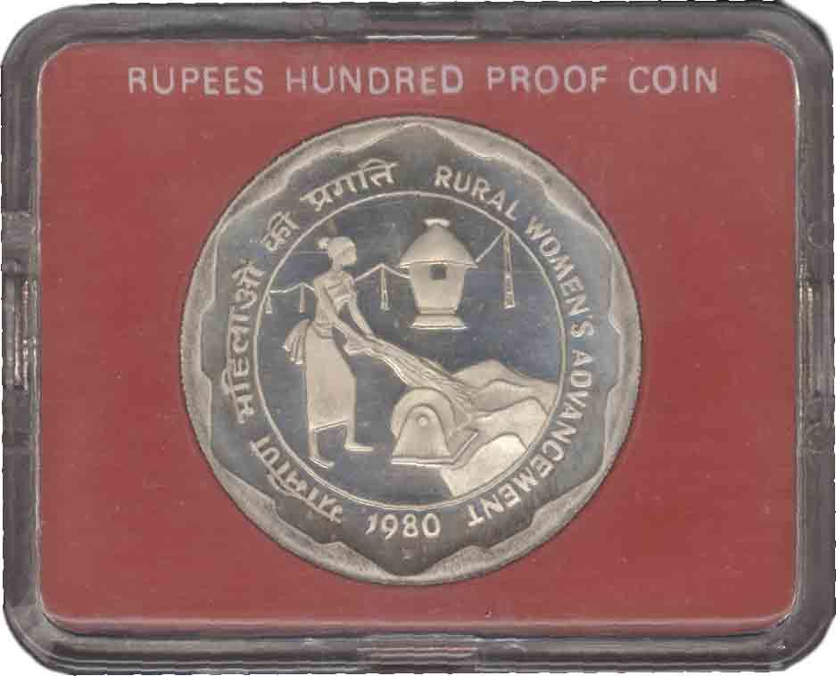1980, Proof Set (One Coin), Rural Women Advancement,100 Rupees, Bombay Mint, (RB # 79),intact condition of the certificate and cover with acrylic case, Rare.
