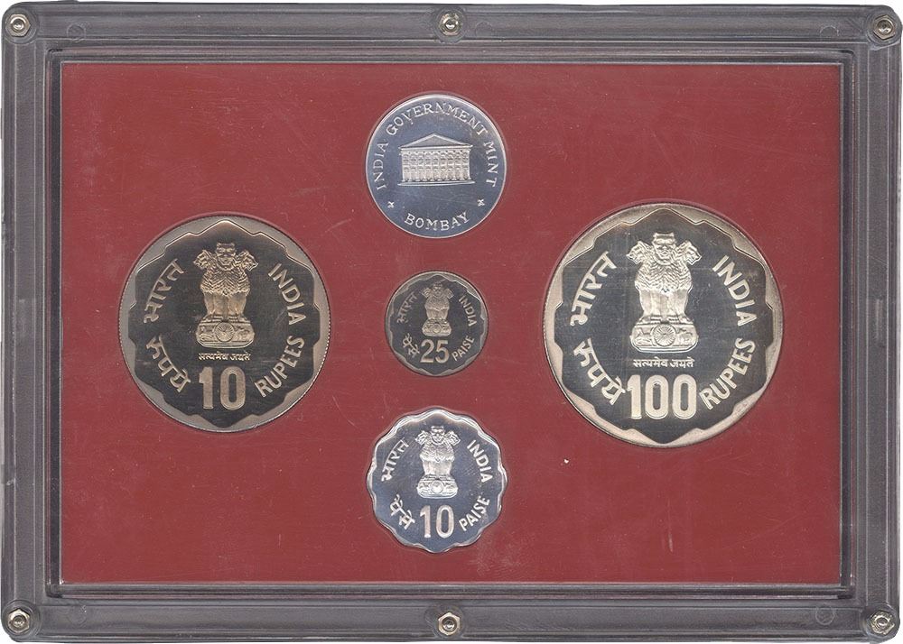 1980,Proof Set,Rural Women's Advancement,10 Paise, 25 Paise, 10 Rupees and 100 Rupees,I.G Bombay Mint,(RB # 77), intactin acrylic case with excellent condition of the certificate and outer cover, Rare.