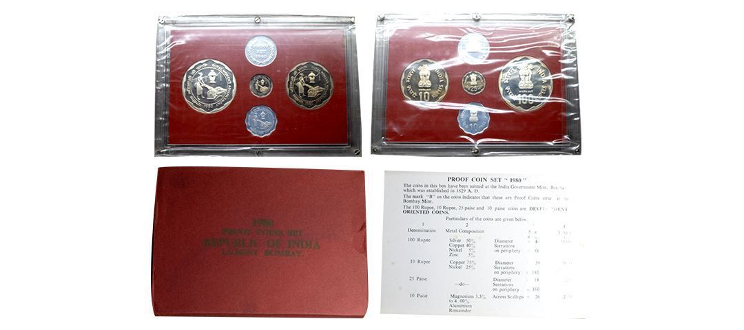 1980, Rural Women's Advancement, Proof set of 4 coins, 100 Rupees, 10 Rupees, 25 Paise and 10 Paise,