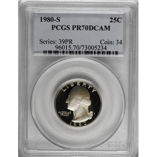 <B>1980-S 25C PR70 Deep Cameo PCGS.</B></I> PCGS Population (112/0). NGC Census: (3/0). Numismedia Wsl. Price for NGC/PCGS coin in PR70: $130. (#96015)<BR><BR><b>Shipping:</b> Coins & Currency (<a target="_blank" href="http://www.heritageauctions.com/common/shipping.php">view shipping information</a>)