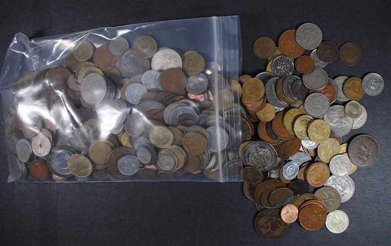 1980'S & OLDER MIX OF UNSEARCHED FOREIGN COINS, MANY LARGER COINS (5 POUND BAG)