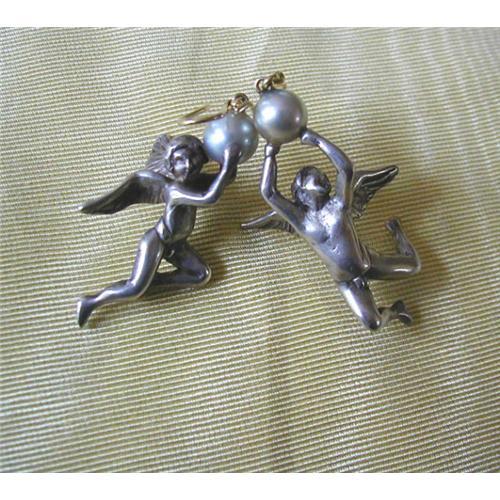 ART WEAR 1980 ~ A STERLING SILVER PAIR OF WINGED CHERUBS HOLDING A GREY PEARL BALL / EACH CHERUB SCULPTURED DIFFERENTLY / 14K GOLD EAR WIRES / MINT CONDITION / This stunning pair are unique. Please view the entire collection.