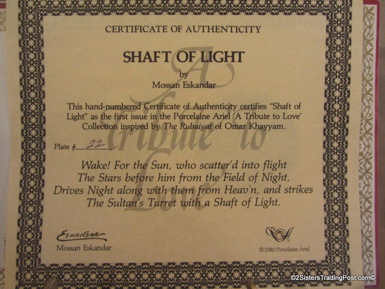 9 3/16" NIB Plate,  dated 1980 and is plate 1 of 12 plates in the "A Tribute to Love" Series inspired by The Rubaiyat of Omar Khayyam. The design is by Mossan Eskandar hand painted on porcelain. This is plate number 22 of the first edition, in a limited edition of 17,500 worldwide. Comes in original box with paperwork. (Please see images for details)