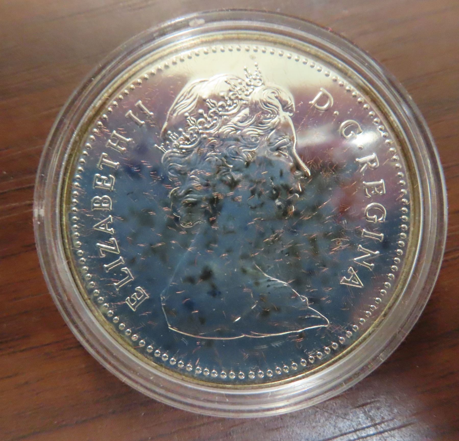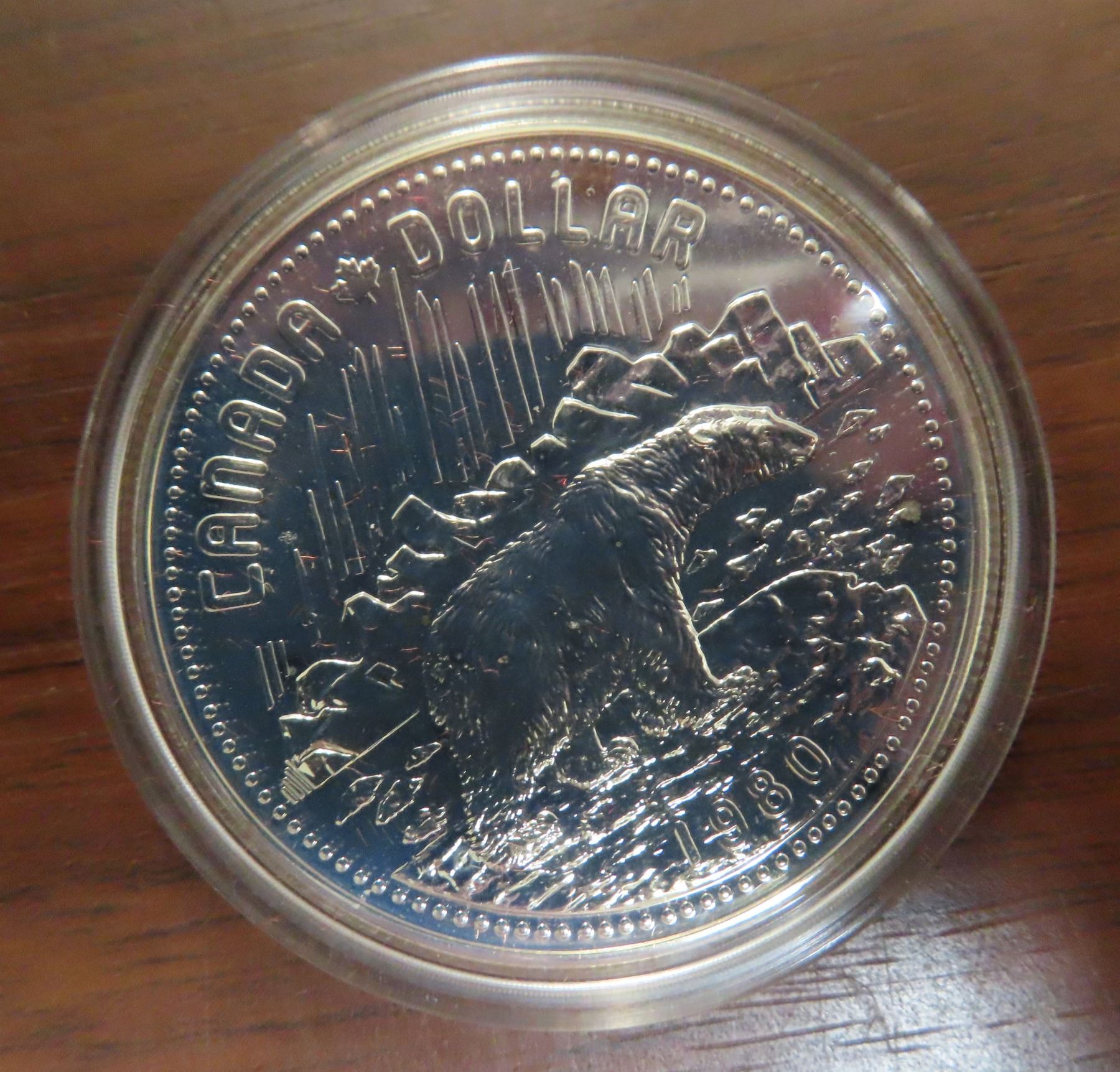 1980 Specimen Silver Dollar. Commemorates the 100th Anniversary of Britain ceding the Arctic Islands to Canada. Popular polar bear. Housed in its original Royal Canadian Mint case of issue. Bright White.