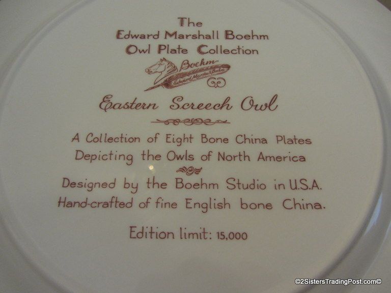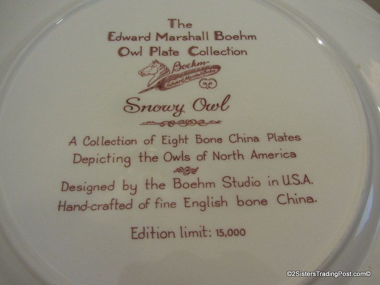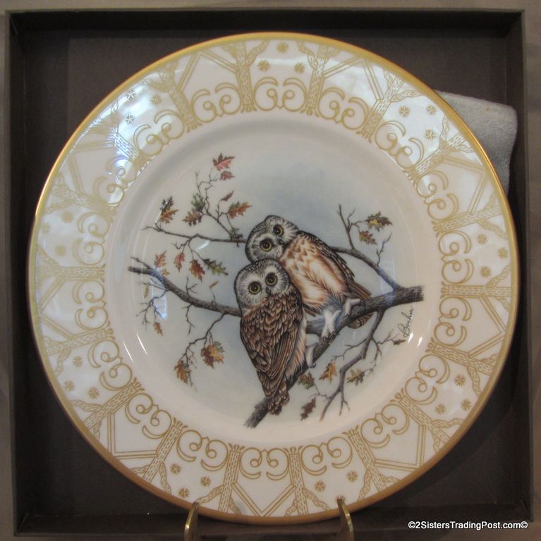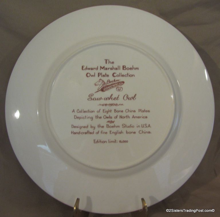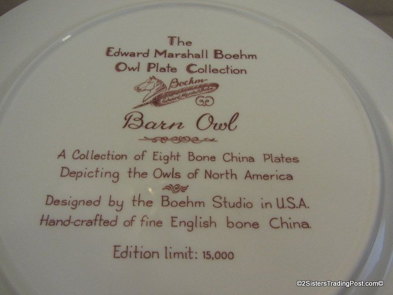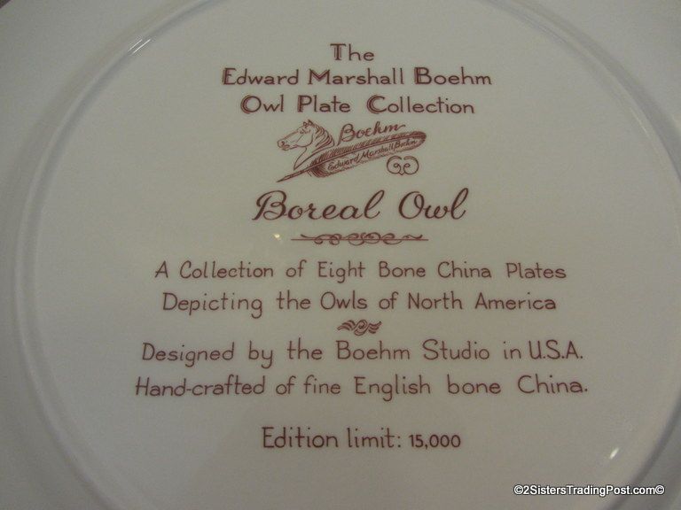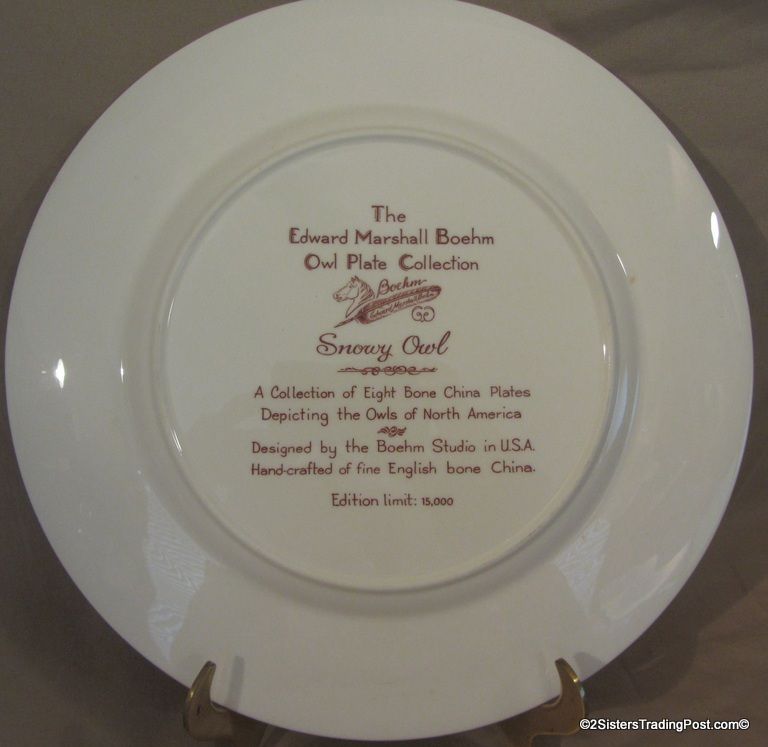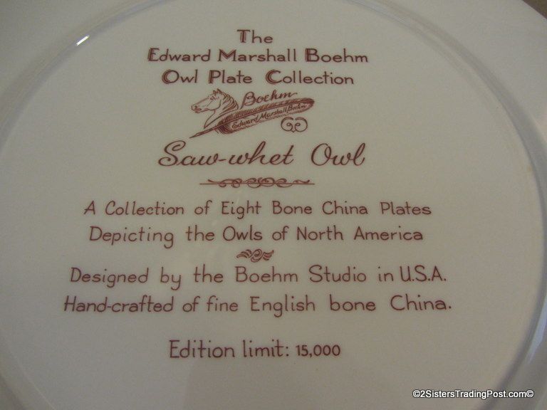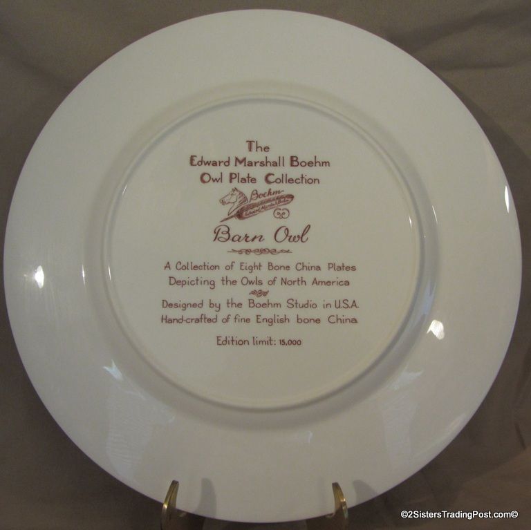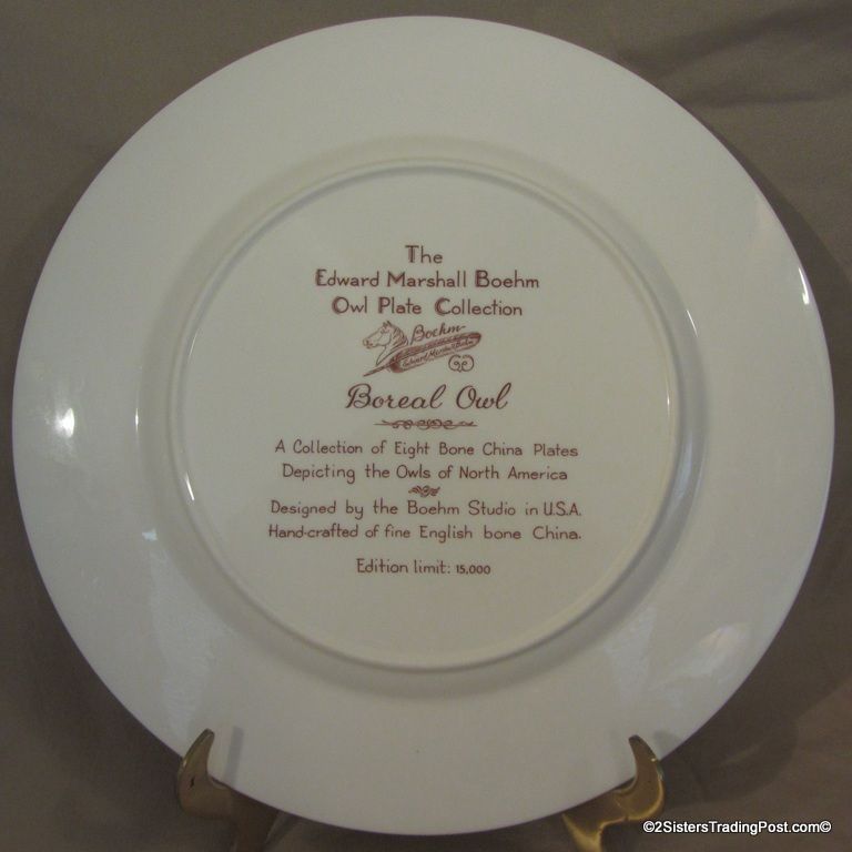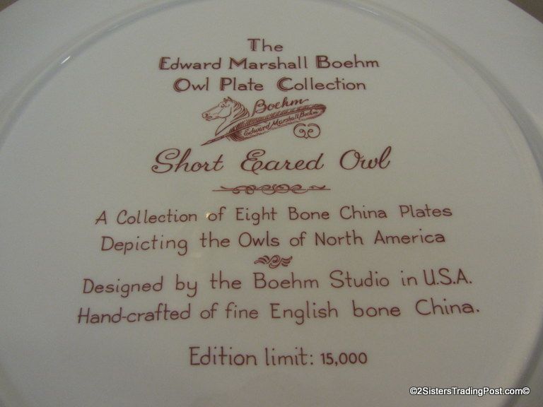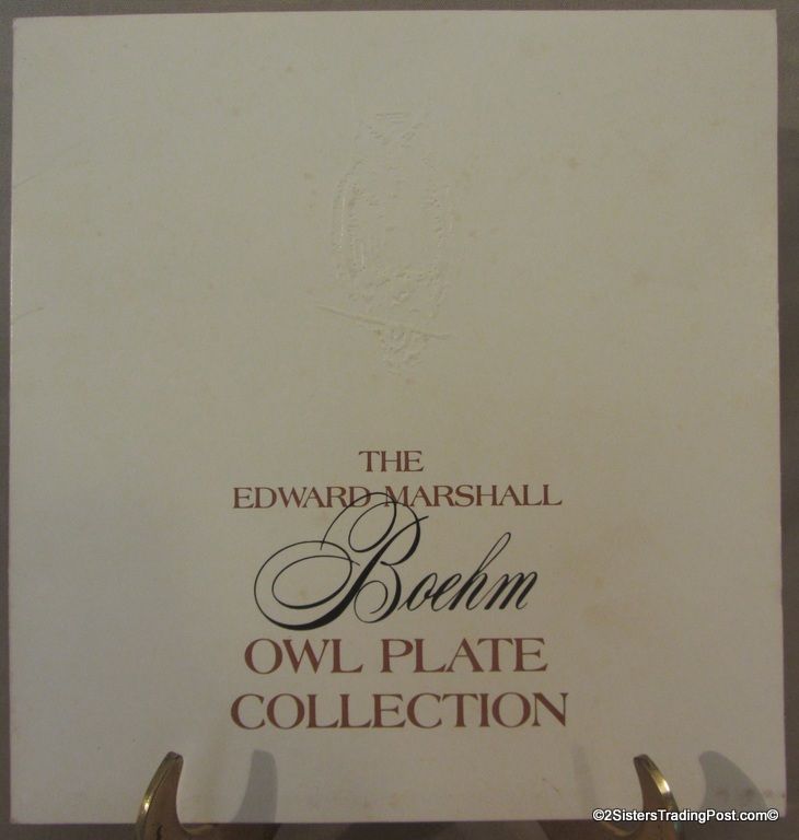 10 3/4" plates from The Edward Marshall Boehm Owl Plate Collection. The collection included a set of 8 owl plates 6 of the 8 are included in this set. Included is 'The Snowy Owl', 'The Short Eared Owl', 'The Saw Whet Owl', 'The Screech Owl', 'The Boreal Owl' & 'The Barn Owl'. The 2 plates that are missing from the collection are 'The Great Horned Owl' & 'The Barred Owl'. All plates are in excellent condition and are in the original boxes with the brochure and the individual papers for each plate including the papers for the 2 plates that are missing from the collection. (Please see images for details)