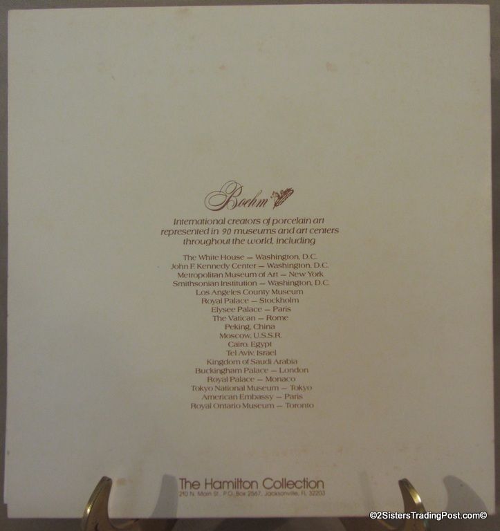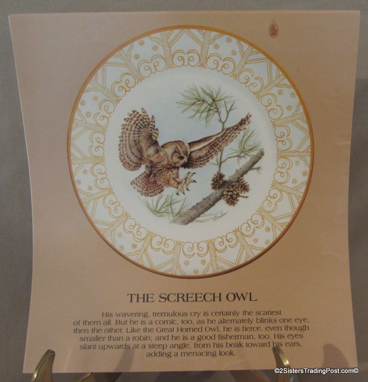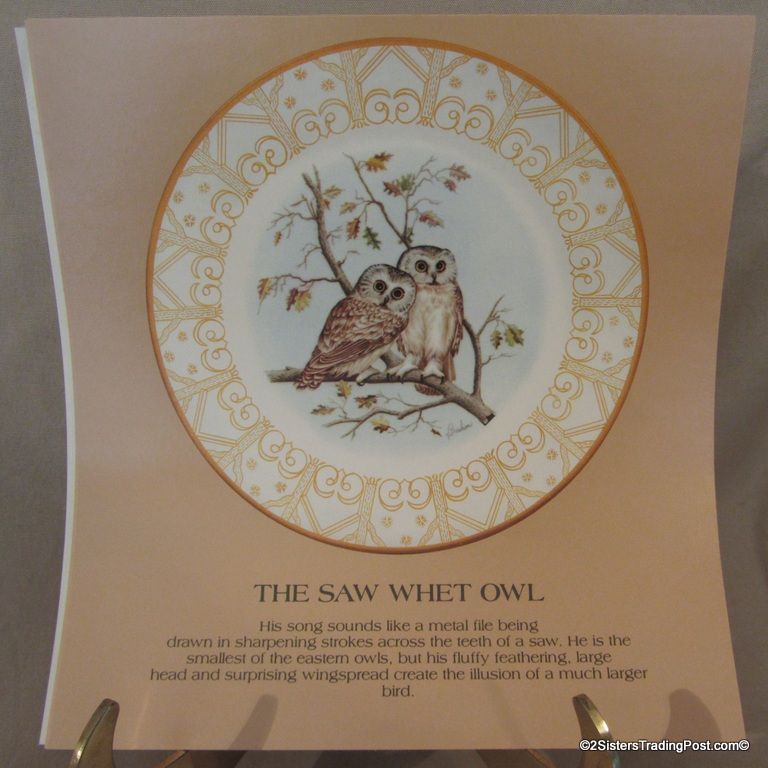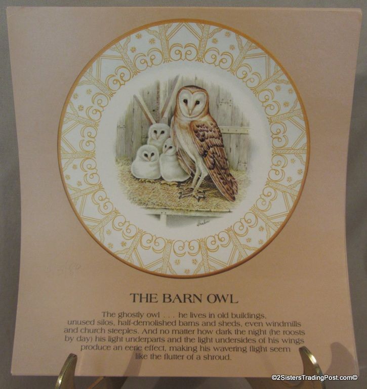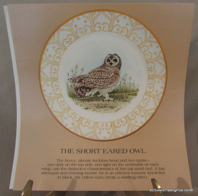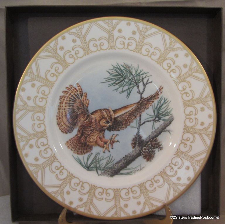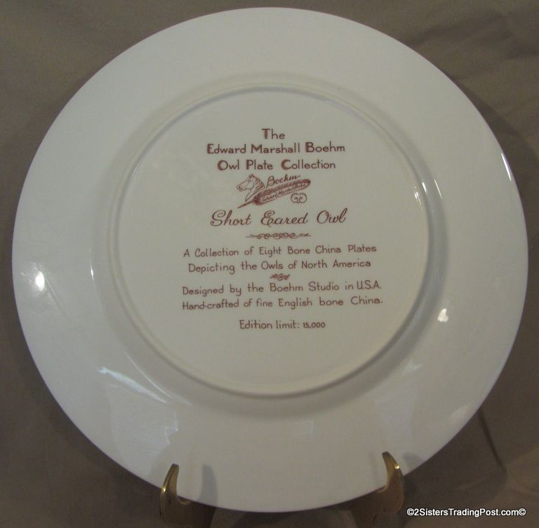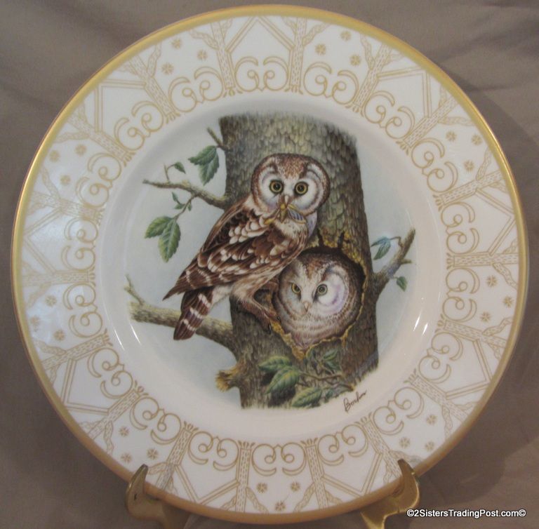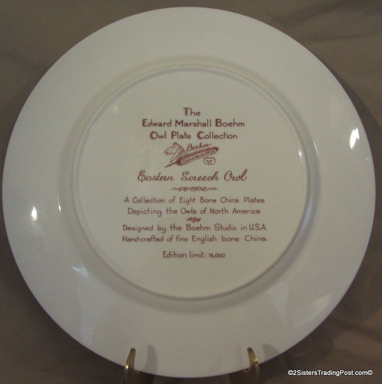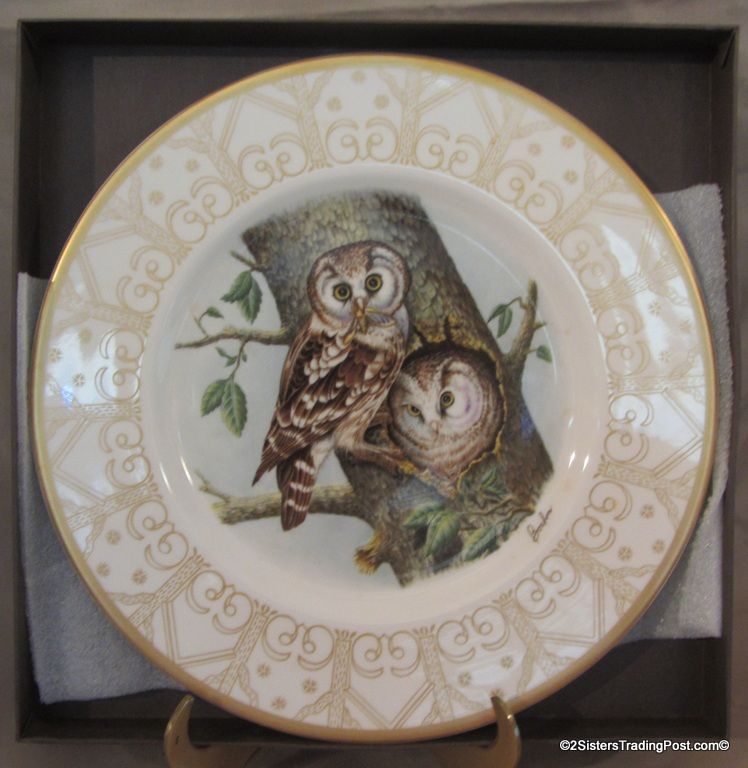 10 3/4" plates from The Edward Marshall Boehm Owl Plate Collection. The collection included a set of 8 owl plates 6 of the 8 are included in this set. Included is 'The Snowy Owl', 'The Short Eared Owl', 'The Saw Whet Owl', 'The Screech Owl', 'The Boreal Owl' & 'The Barn Owl'. The 2 plates that are missing from the collection are 'The Great Horned Owl' & 'The Barred Owl'. All plates are in excellent condition and are in the original boxes with the brochure and the individual papers for each plate including the papers for the 2 plates that are missing from the collection. (Please see images for details)