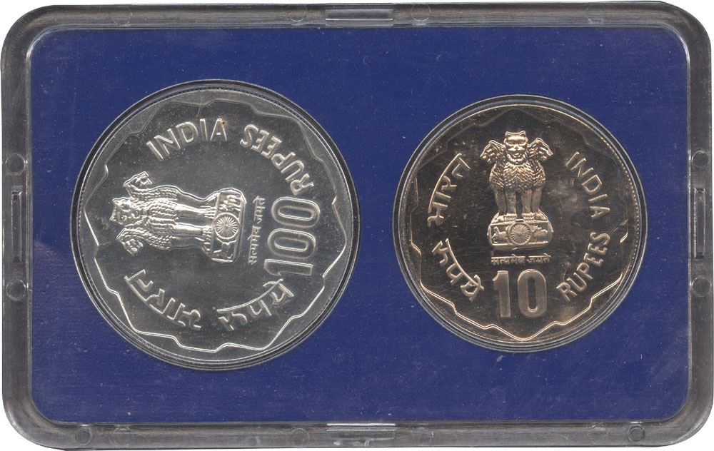 1980, UNC Set, Rural Women's Advancement, 10 Rupees and 100 Rupees, Bombay Mint,intact condition of the certificate and cover with acrylic case.