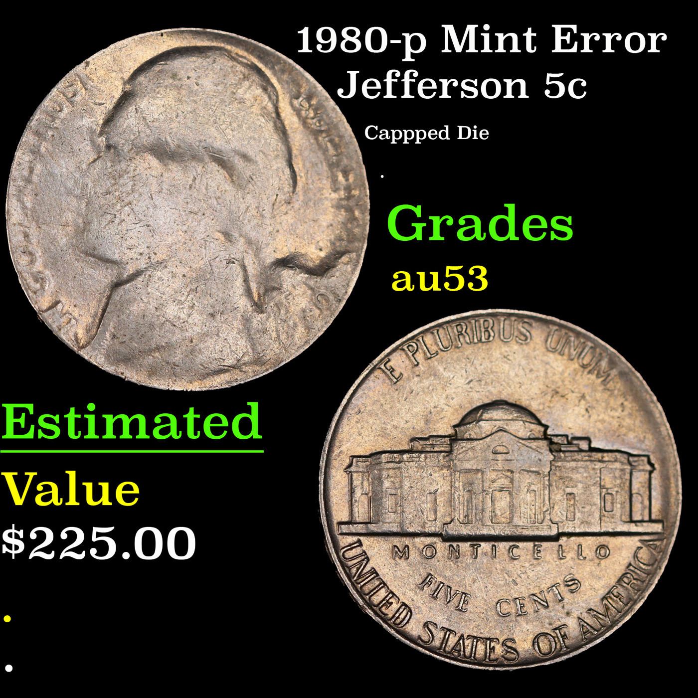 1980-p Mint Error Jefferson Nickel 5c Grades Select AU.